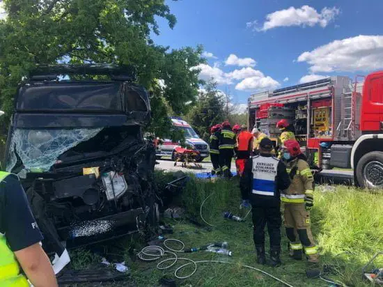 W piątek, 29 maja 2020r., przed godziną 12, na drodze wojewódzkiej numer 305 w Przyłęku, doszło do poważnego wypadku drogowego z udziałem dwóch samochodów ciężarowych. W tył zestawu przeznaczonego do przewozu drewna uderzyła ciężarówka – autolaweta z przyczepą, na której przewożono dwa samochody osobowe. Pojazdy poruszały się w tym samym kierunku. Siła zderzenia była ogromna, co spowodowało uwięzienie kierowcy w zmiażdżonej kabinie Mercedesa. Na miejsce zdarzenia natychmiast zadysponowano strażaków z nowotomyskiej JRG, Zespół Ratownictwa Medycznego i Policje. Do uwolnienia kierowcy mieszkańca Pleszewa konieczne było zastosowanie specjalistycznego sprzętu hydraulicznego i innych narzędzi ratowniczych. Po kilkunastu minutach walki o życie kierowcy poszkodowany z obrażeniami nóg trafił do karetki i został przetransportowany do szpitala w Nowym Tomyślu, a dalej śmigłowcem Lotniczego Pogotowia Ratunkowego do jednego z poznańskich szpitali. Na czas prowadzonych działań ratowniczych ruch kołowy na tym odcinku drogi był całkowicie wstrzymany.