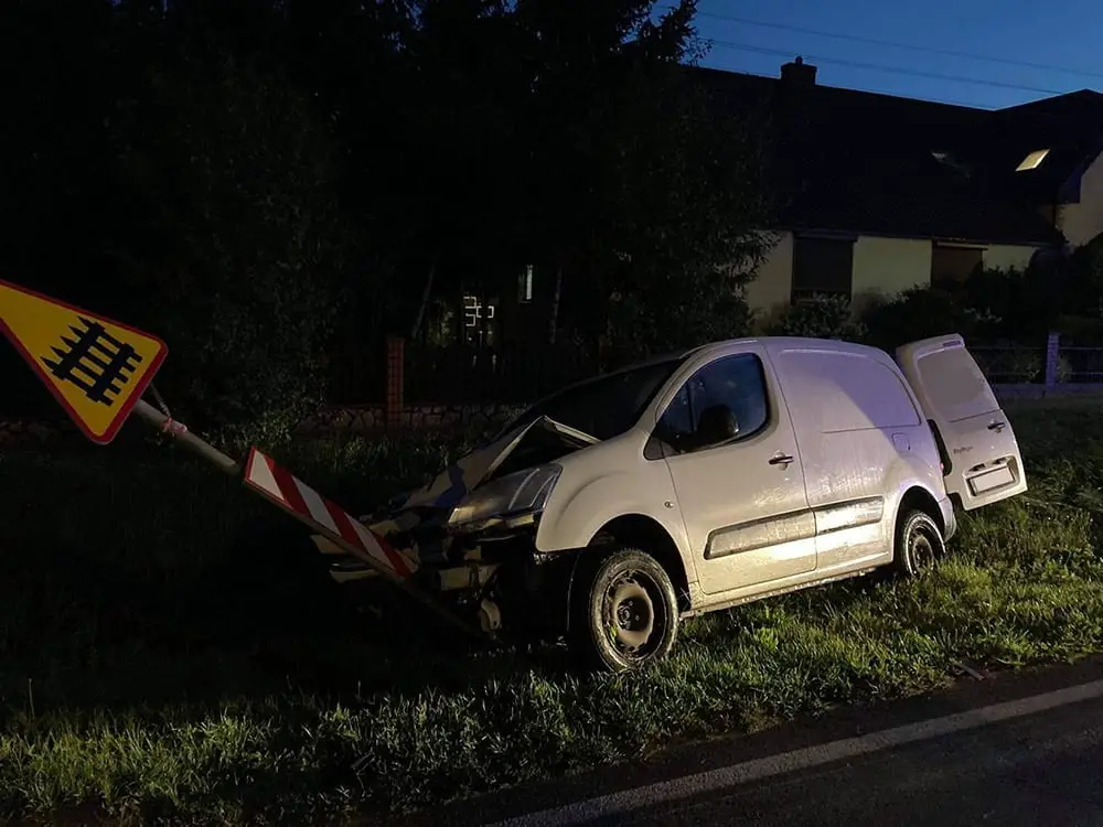 Kierujący citroenem berlingo uderzył w nissana primerę. Po zderzeniu nissan wypadł z drogi uderzając w ogrodzenie jednej z posesji. Citroen zatrzymał się w znak drogowy.