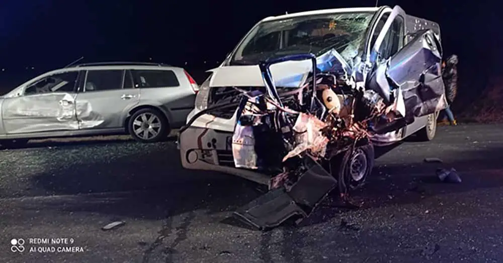 Zderzyły się dwa samochody osobowe i bus. Zmiażdżona dosłownie osobówka wypadła z drogi. Druga została na jezdni, tak samo jak rozbity bus.
