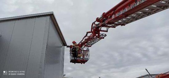 Strażacy po zabezpieczeniu miejsca zdarzenia przystąpili do akcji gaśniczej. Realizując działania w sprzęcie ochrony układu oddechowego, podali jeden prąd gaśniczy wody w natarciu na palące się urządzenie filtrujące, skutecznie tłumiąc pożar. Po sprawieniu podnośnika hydraulicznego uzyskali dostęp do powierzchni dachowej hali produkcyjnej celem demontażu części opierzenia i schłodzenia miejsc o podwyższonej temperaturze. Obiekt został oddymiony i przewietrzony. Po sprawdzeniu hali urządzeniami pomiarowymi działania trwające łącznie 1 godzinę i 46 minut zakończono i zastępy powróciły do miejsca stacjonowania.