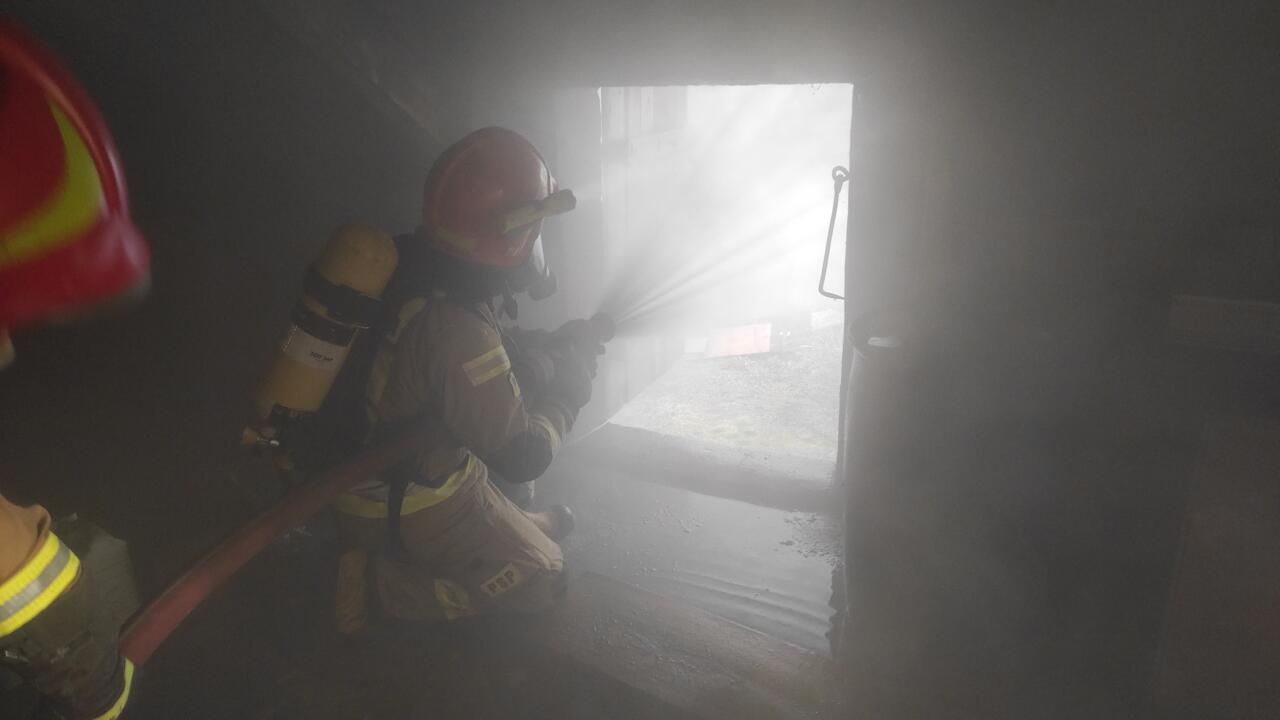 Strażacy zabezpieczeni w sprzęt ODO przy użyciu podręcznego sprzętu burzącego wykonali dostęp do pomieszczeń. Następnie przystąpiono do gaszenia pożaru w tym poddasza i więźby dachowej. Podczas prowadzonych działań gaśniczych strażacy zauważyli uszkodzoną butlę z gazem propan-butan, która była nadpalona i ulatniał się z niej gaz. Wyniesioną butle włożono do metalowej beczki z wodą w celu ochłodzenia, aż do opróżnienia gazu.