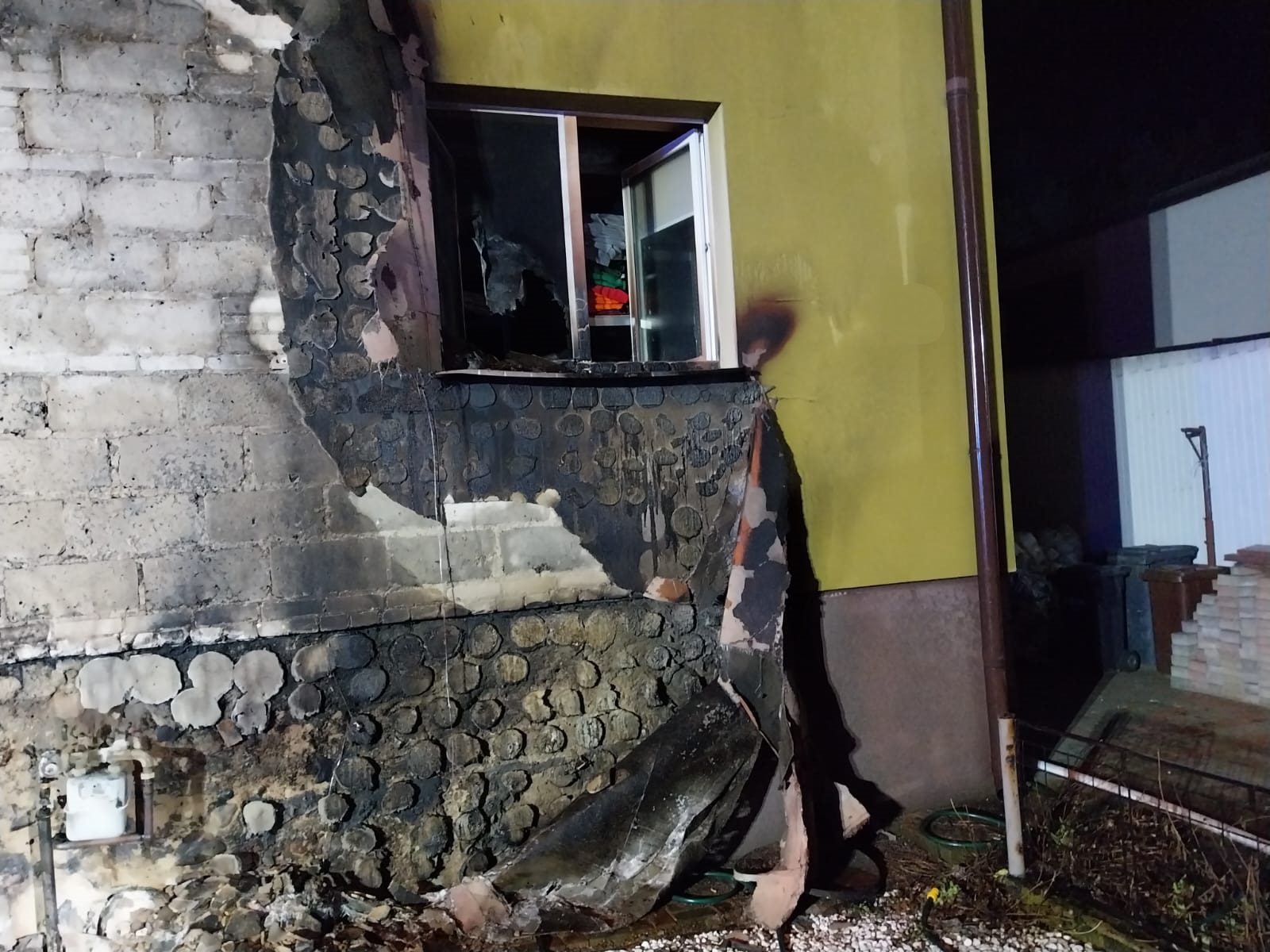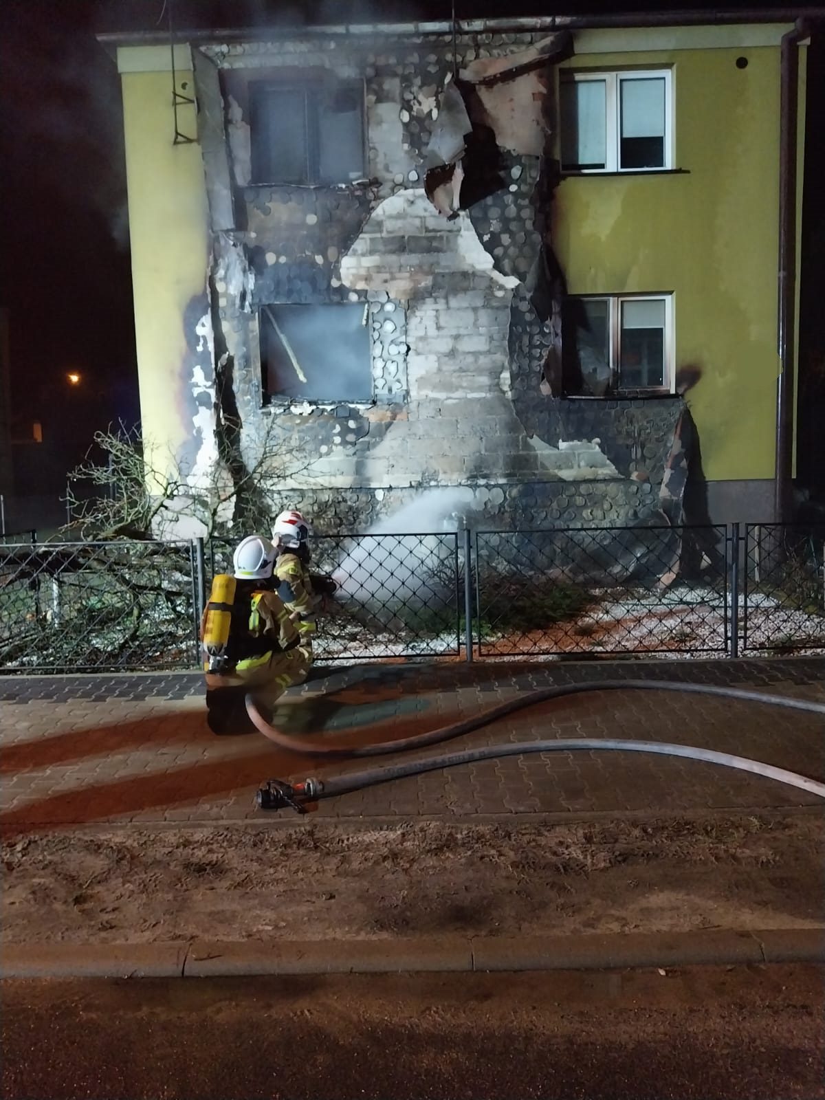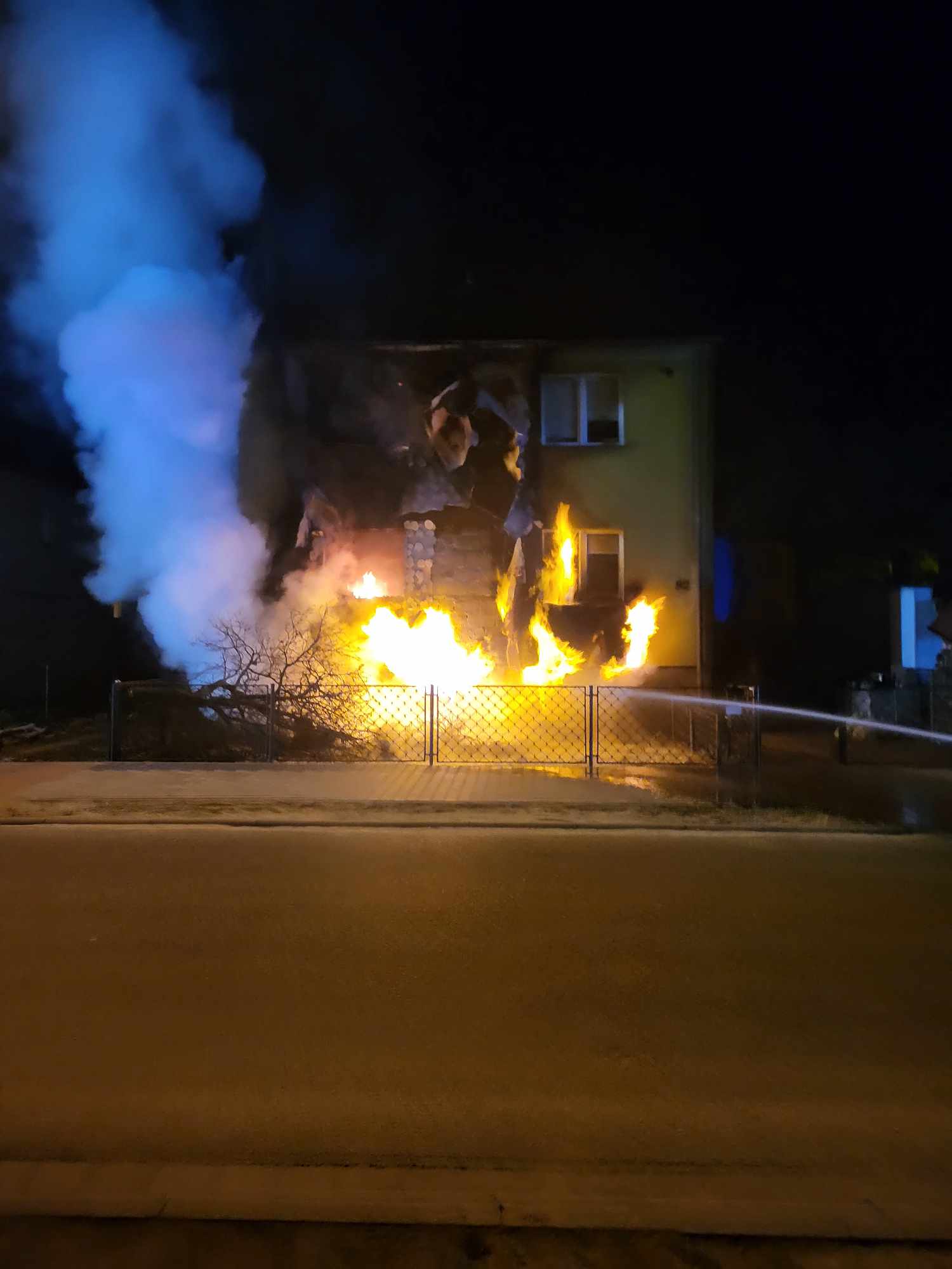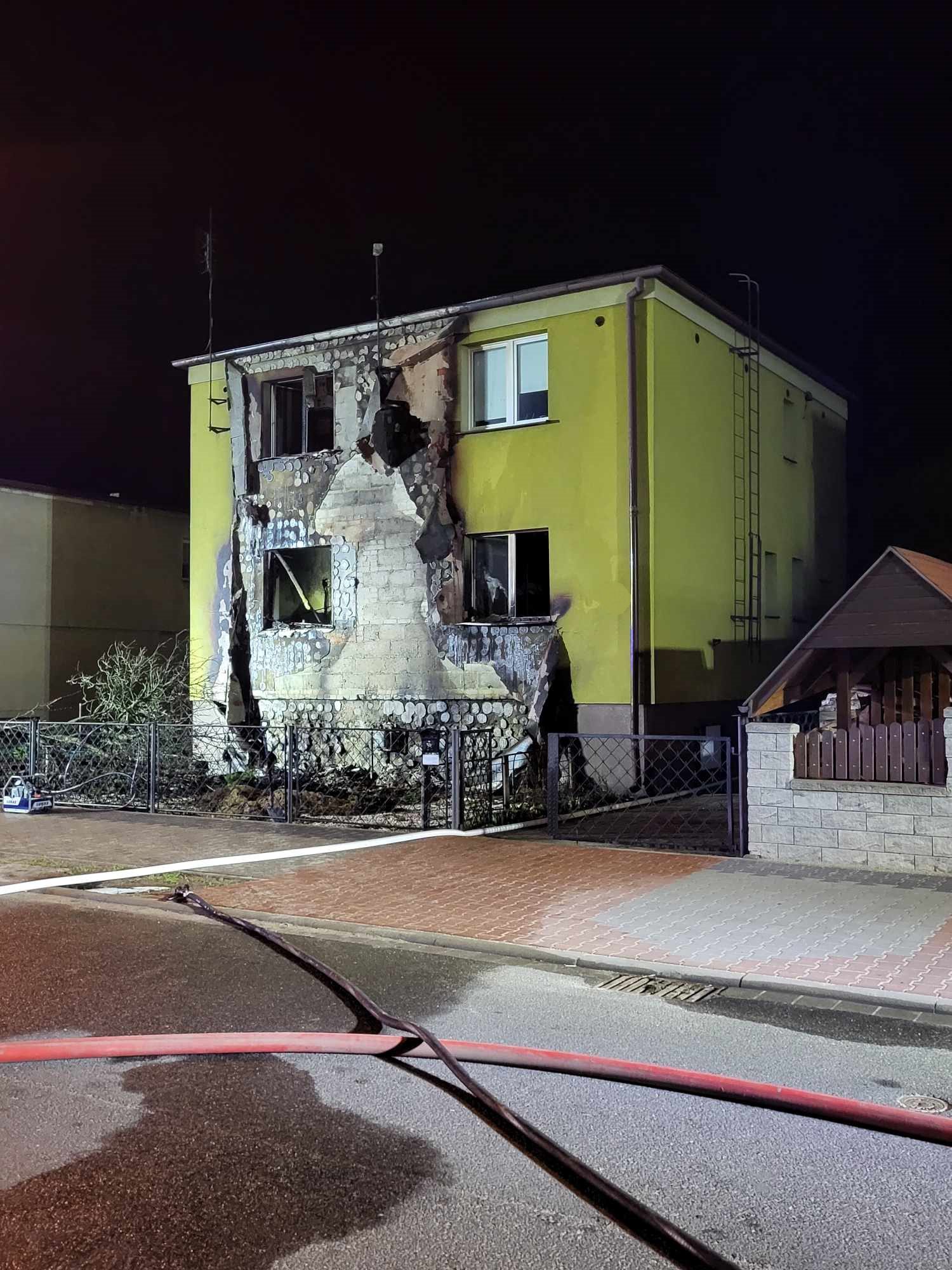 Po dojeździe na miejsce zdarzenia strażacy zastali pożar budynku mieszkalnego, skrzynki gazowej znajdującej się na ścianie oraz elewacji budynku. Mieszkańcy opuścili budynek przed przybyciem SP i znajdowali się na zewnątrz.