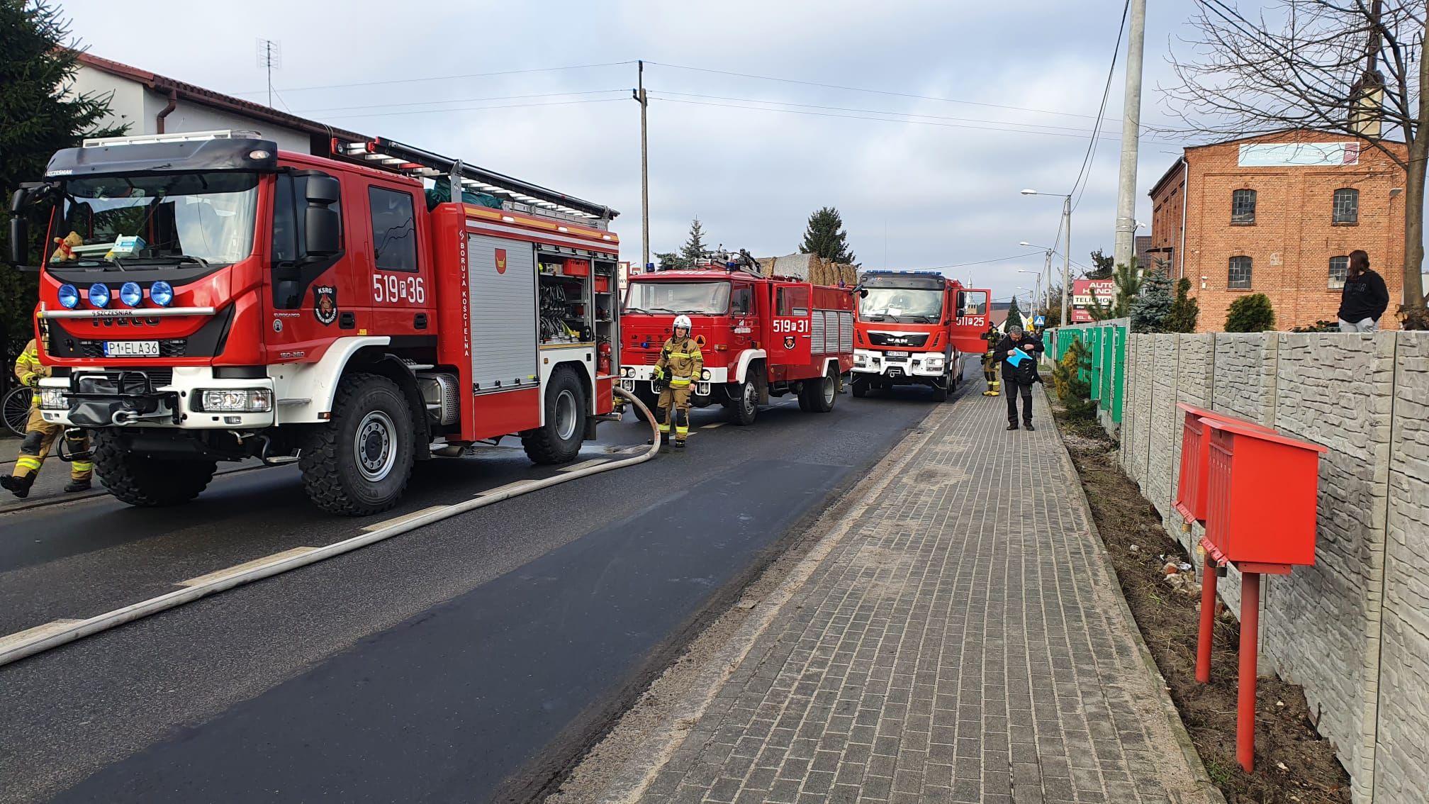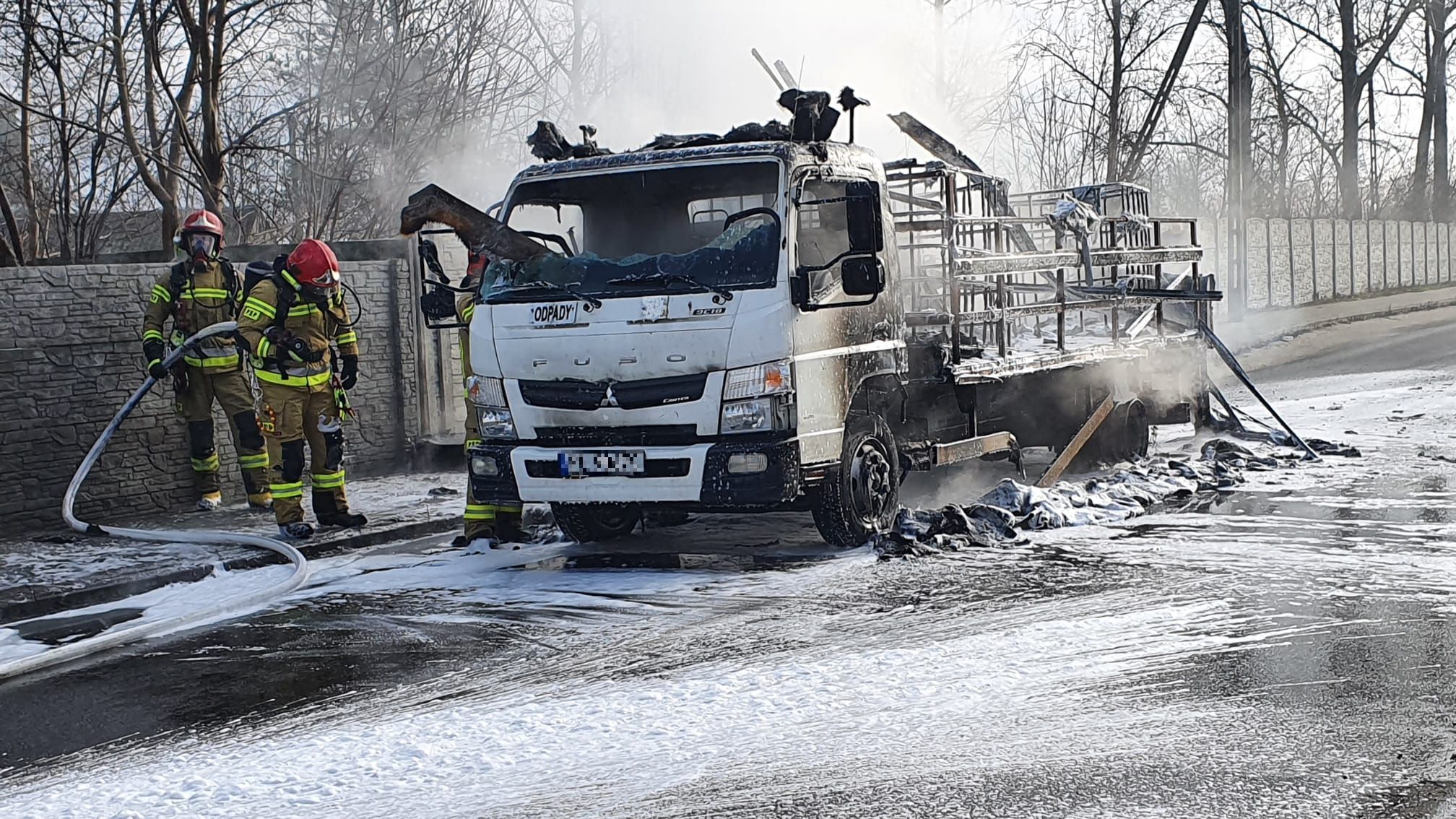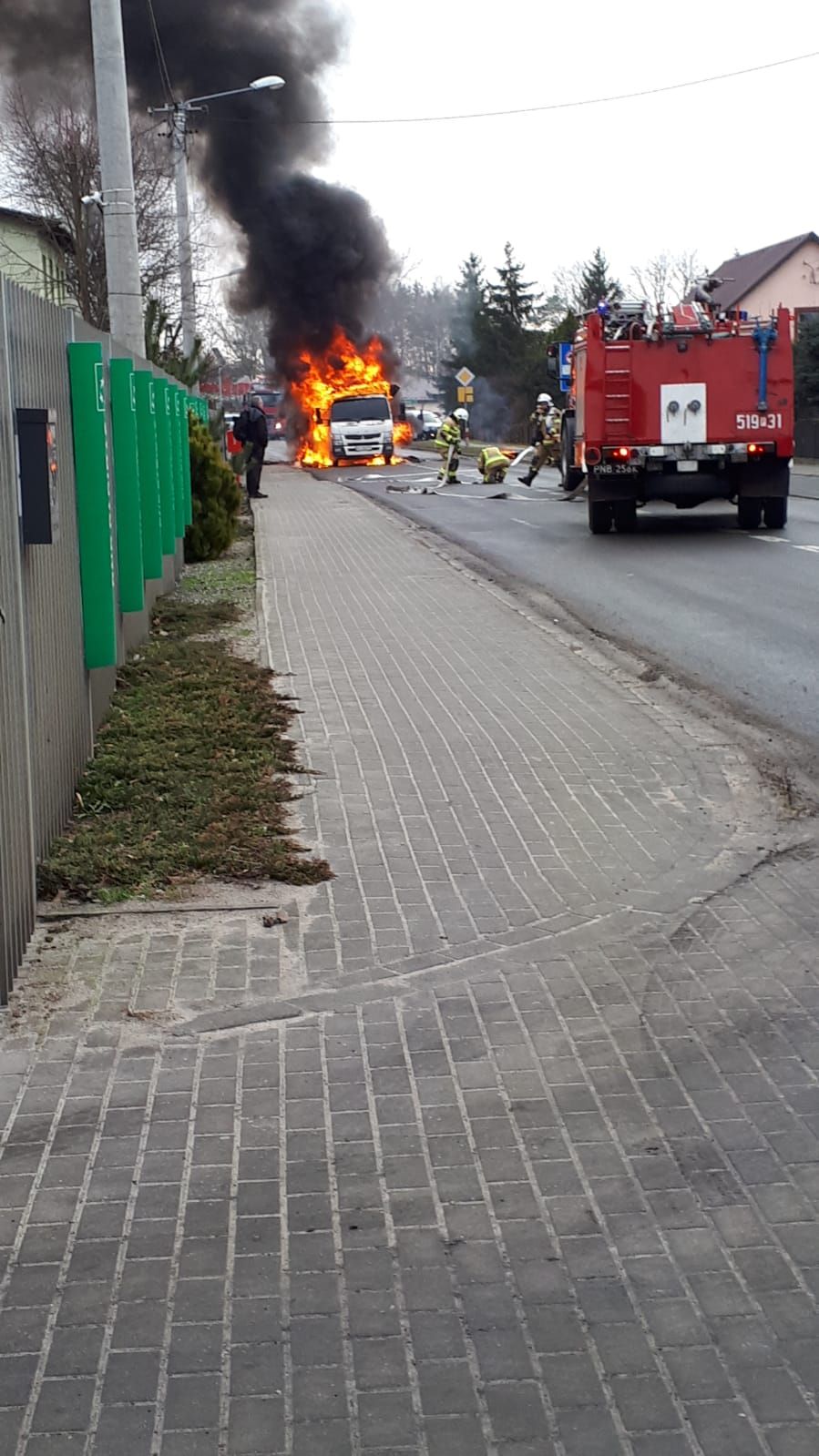 Po przybyciu straży pożarnej na miejsce zdarzenia zastano samochód dostawczy całkowicie w ogniu, stojący na pasie jezdni. Kierowca znajdował się poza pojazdem i nie wymagał pomocy medycznej. W części transportowej samochód przewoził trzy puste pojemniki typu MAUSER oraz pompę do substancji ciekłych.