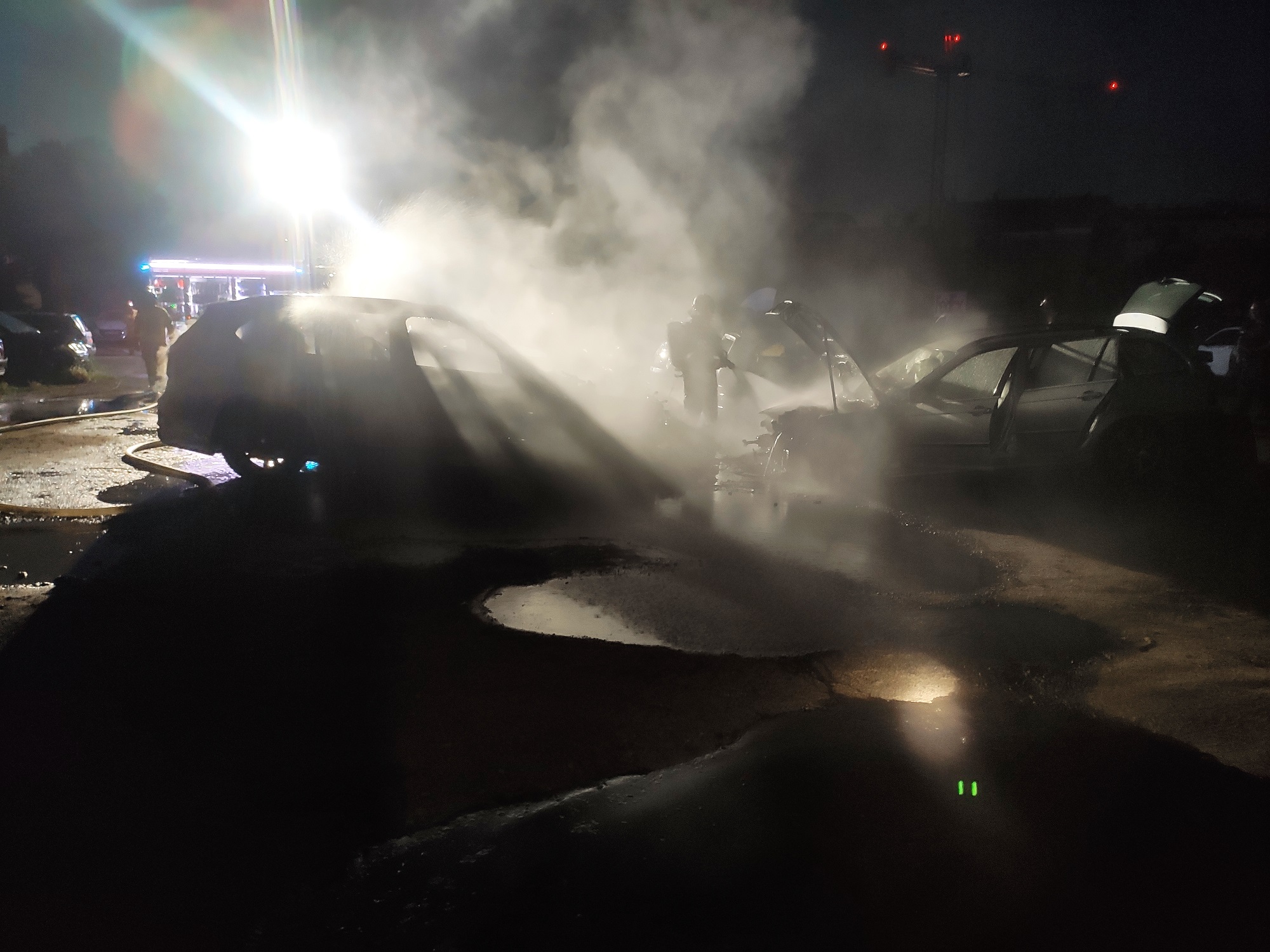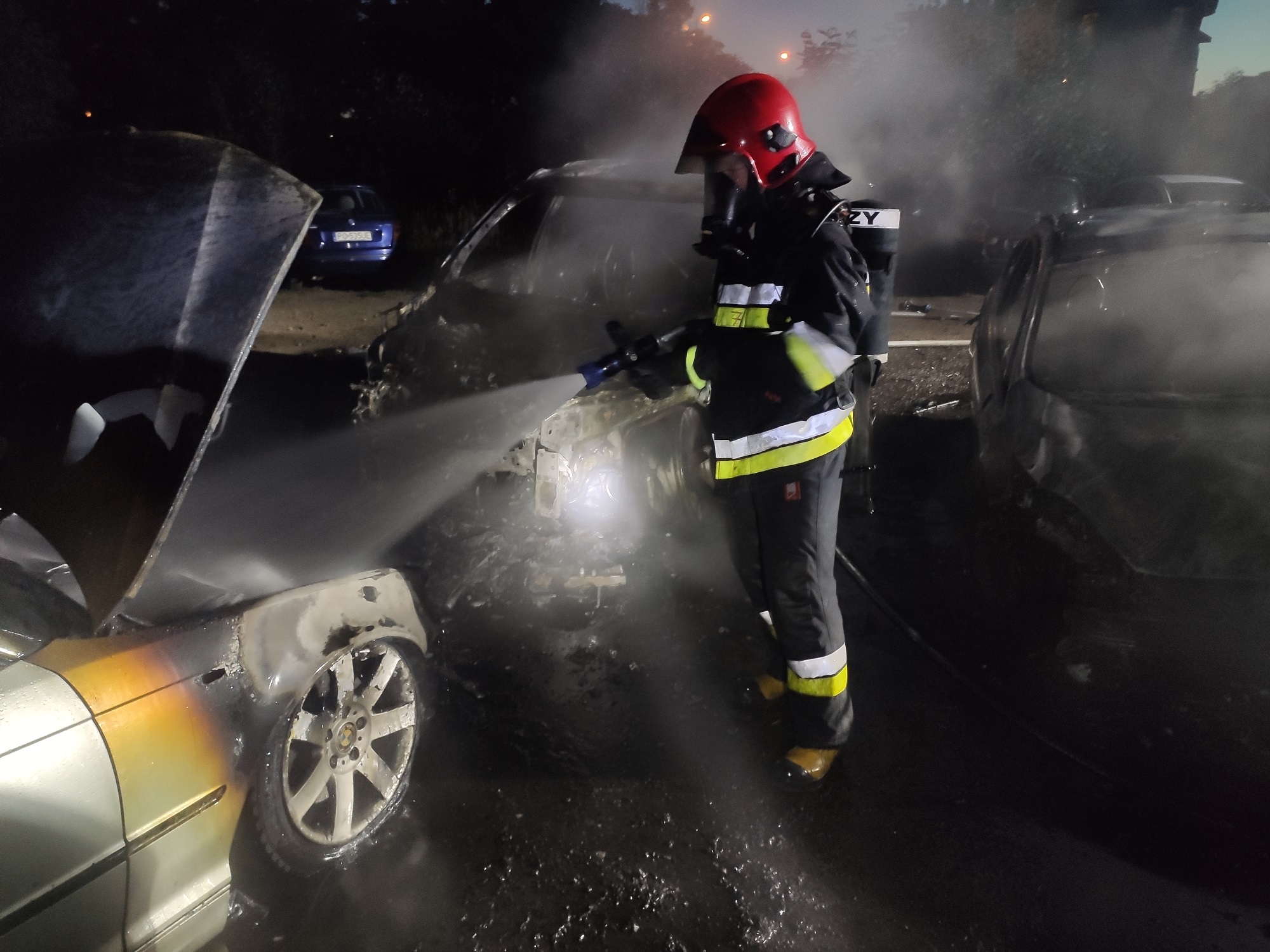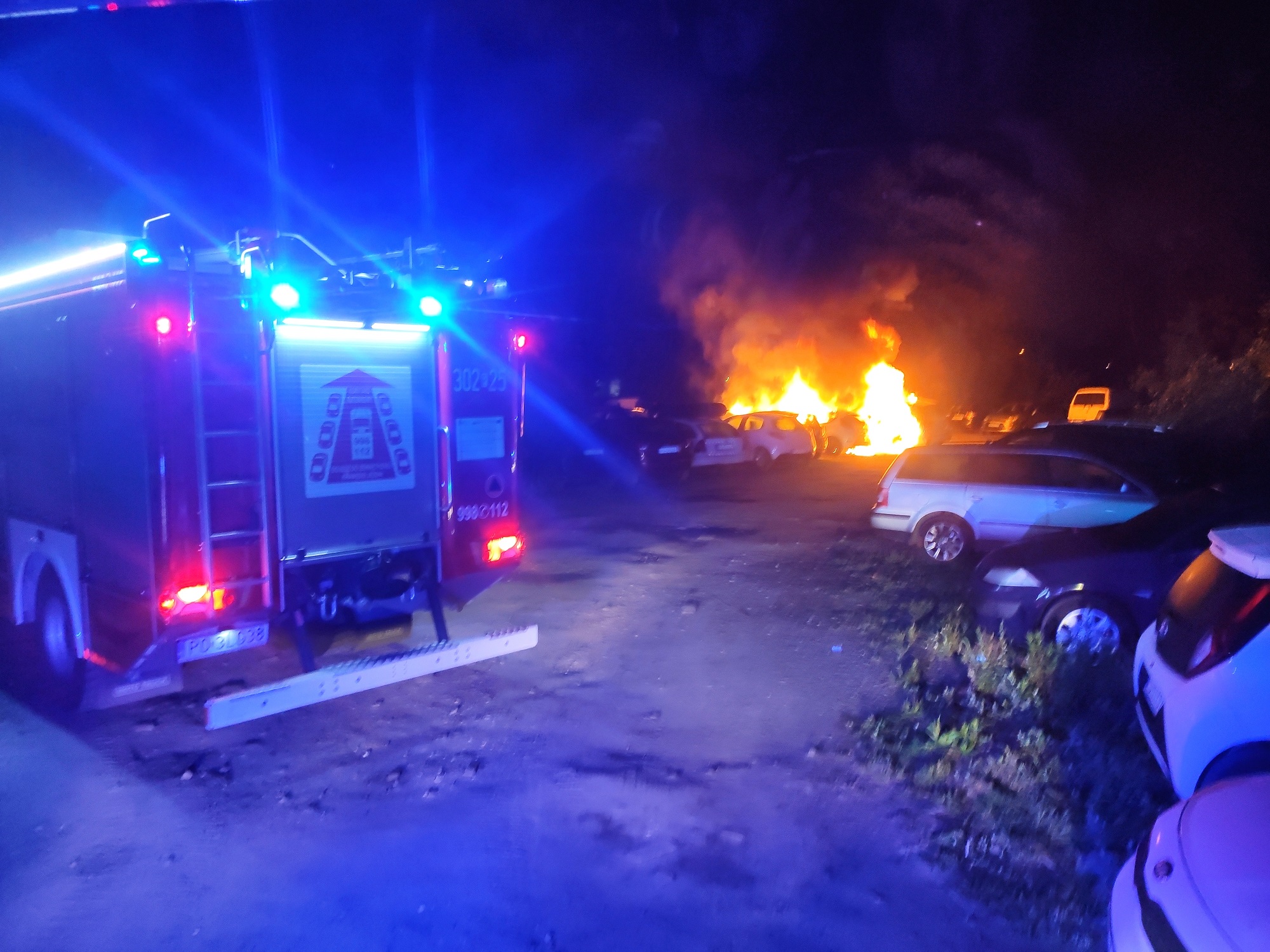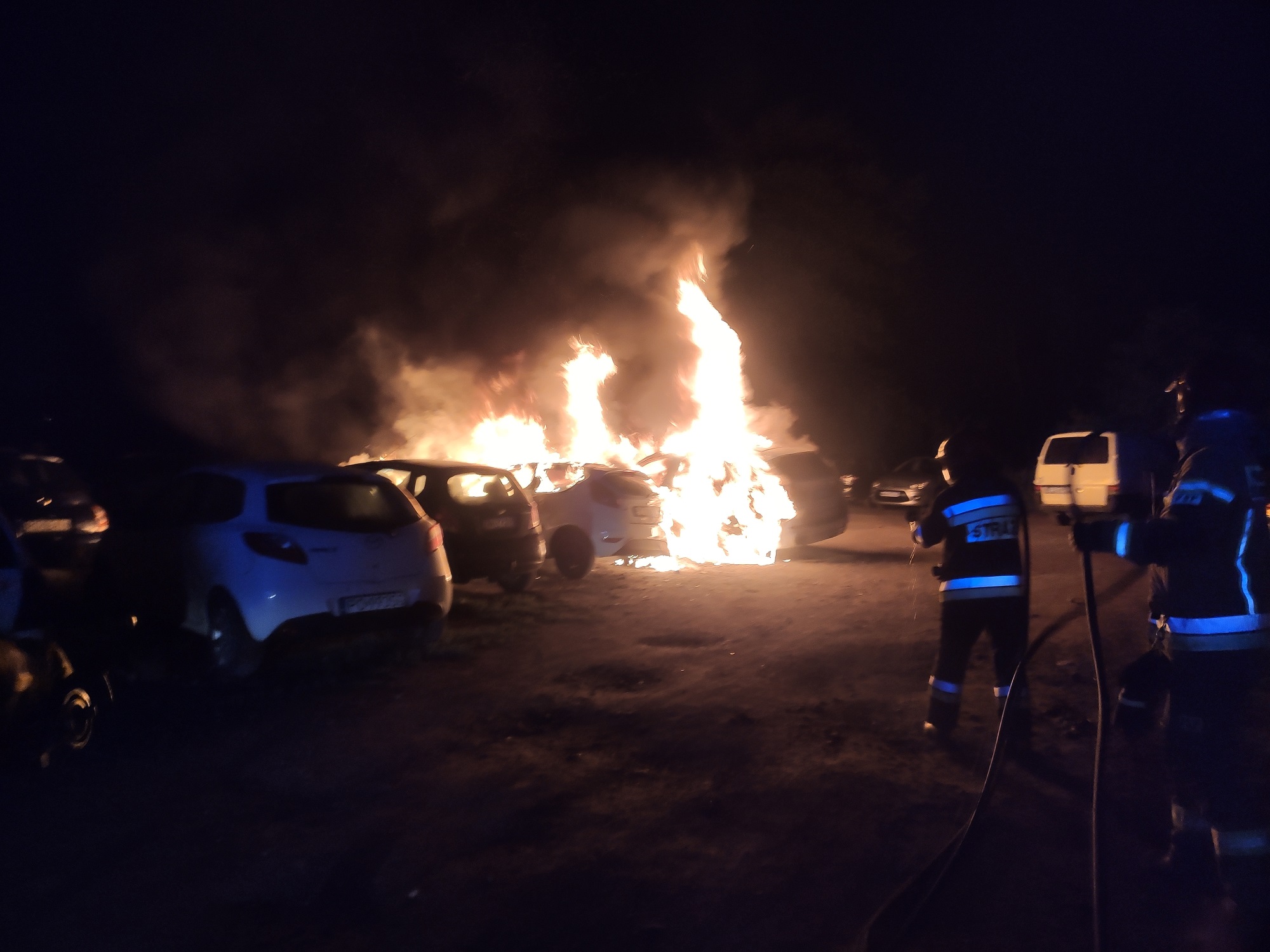 Pożar czterech samochodów osobowych. Dwa spłonęły całkowicie (ZDJĘCIA)