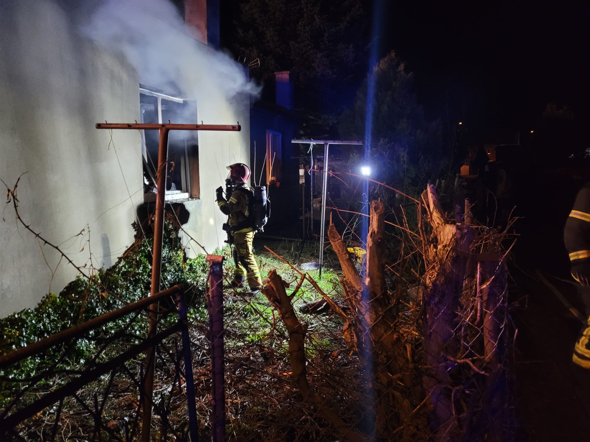 Działania Straży Pożarnej polegały na zabezpieczeniu miejsca zdarzenia, następnie wprowadzono dwie roty strażaków do mieszkania (z uwagi na duże zadymienie strażacy pracowali w aparatach ochrony dróg oddechowych). Pierwsza rota podała prąd wody w natarciu na pożar, który ograniczył się do jednego pokoju, druga rota zajęła się przeszukiwaniem pomieszczeń celem potwierdzenia informacji o braku osób w mieszkaniu. Podczas przeszukiwania pomieszczeń strażacy natrafili na psa, który w wyniku pożaru został zaczadzony, niestety nie udało się uratować czworonoga. Po zlokalizowaniu pożaru przystąpiono do wentylacji zadymionych pomieszczeń. Nadpalone materiały z mieszkania w którym powstał pożar wyrzucono na zewnątrz i dogaszono wodą. Sprawdzono również sąsiednie mieszkania pod kątem obecności tlenku węgla. Do czasu przewietrzenia wszystkich pomieszczeń lokatorzy czterech mieszkań pozostali na zewnątrz budynku.