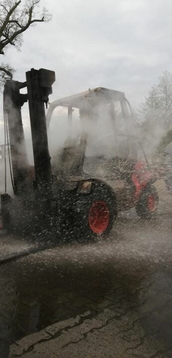Po dojeździe pierwszych zastępów i rozpoznaniu udało się ustalić, że pali się jedna z hal na terenie zakładu. Po rozpoznaniu na palącą się halę podano prądy wody w celu ugaszenia ognia. Spaleniu uległo wnętrze pomieszczenia oraz znajdujący się w niej wózek widłowy.