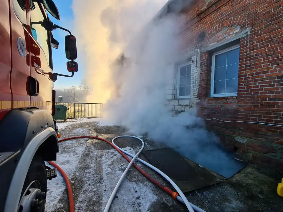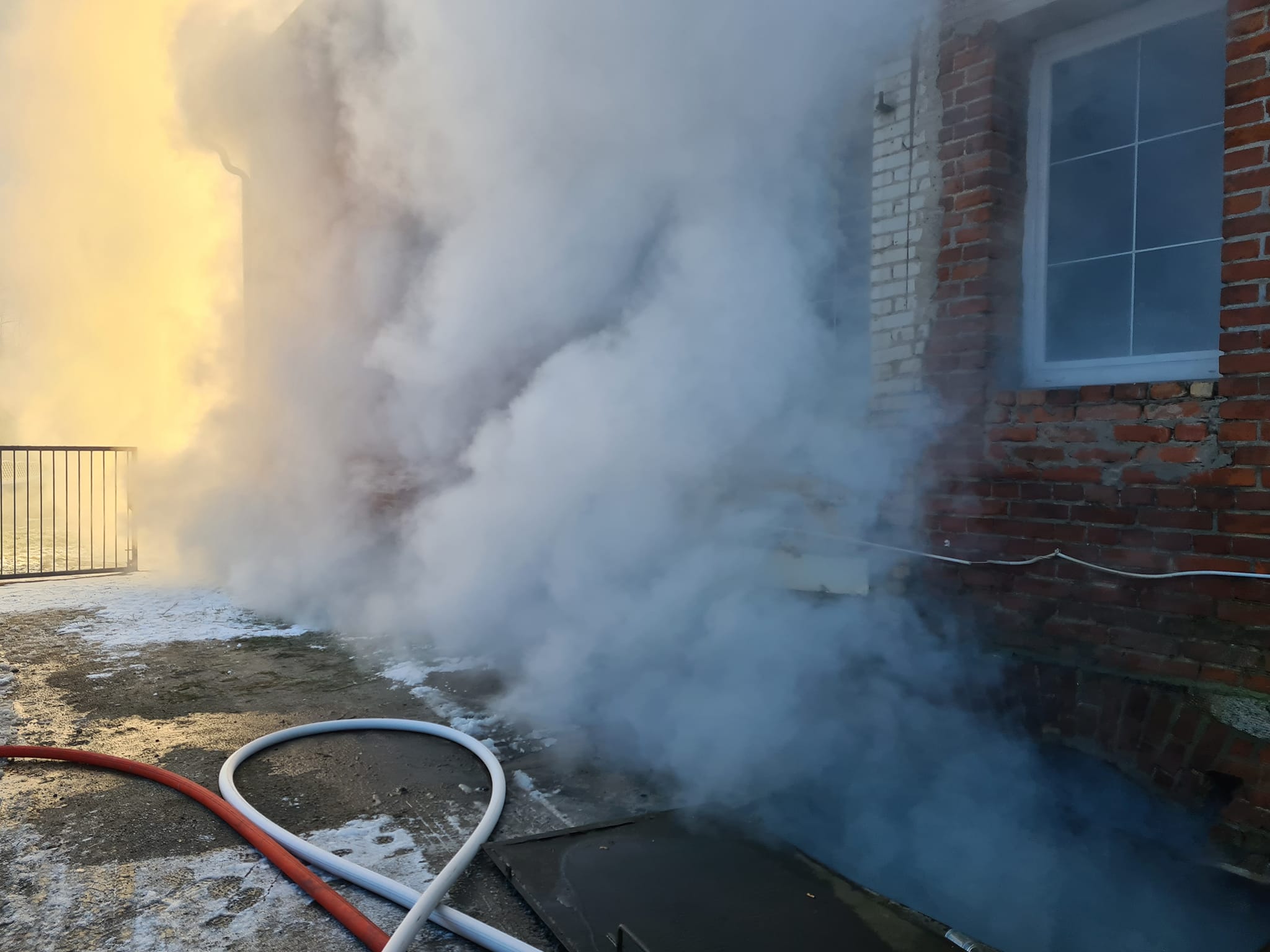 Po dotarciu pierwszego zastępu na miejsce zastano wydobywający się gęsty dym z pomieszczeń piwniczych. Wszystkie osoby będące w budynku zdążyły ewakuować się przed przybyciem służb.