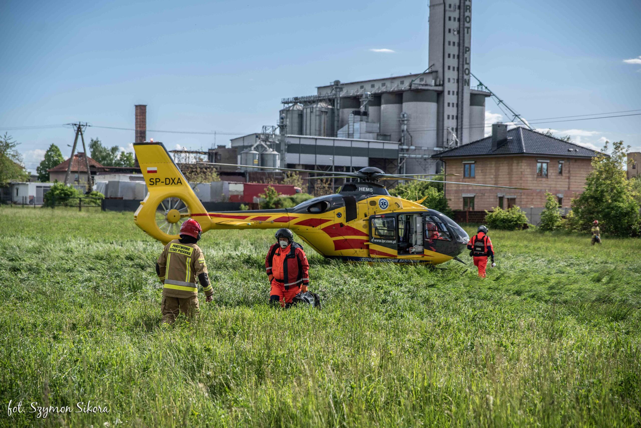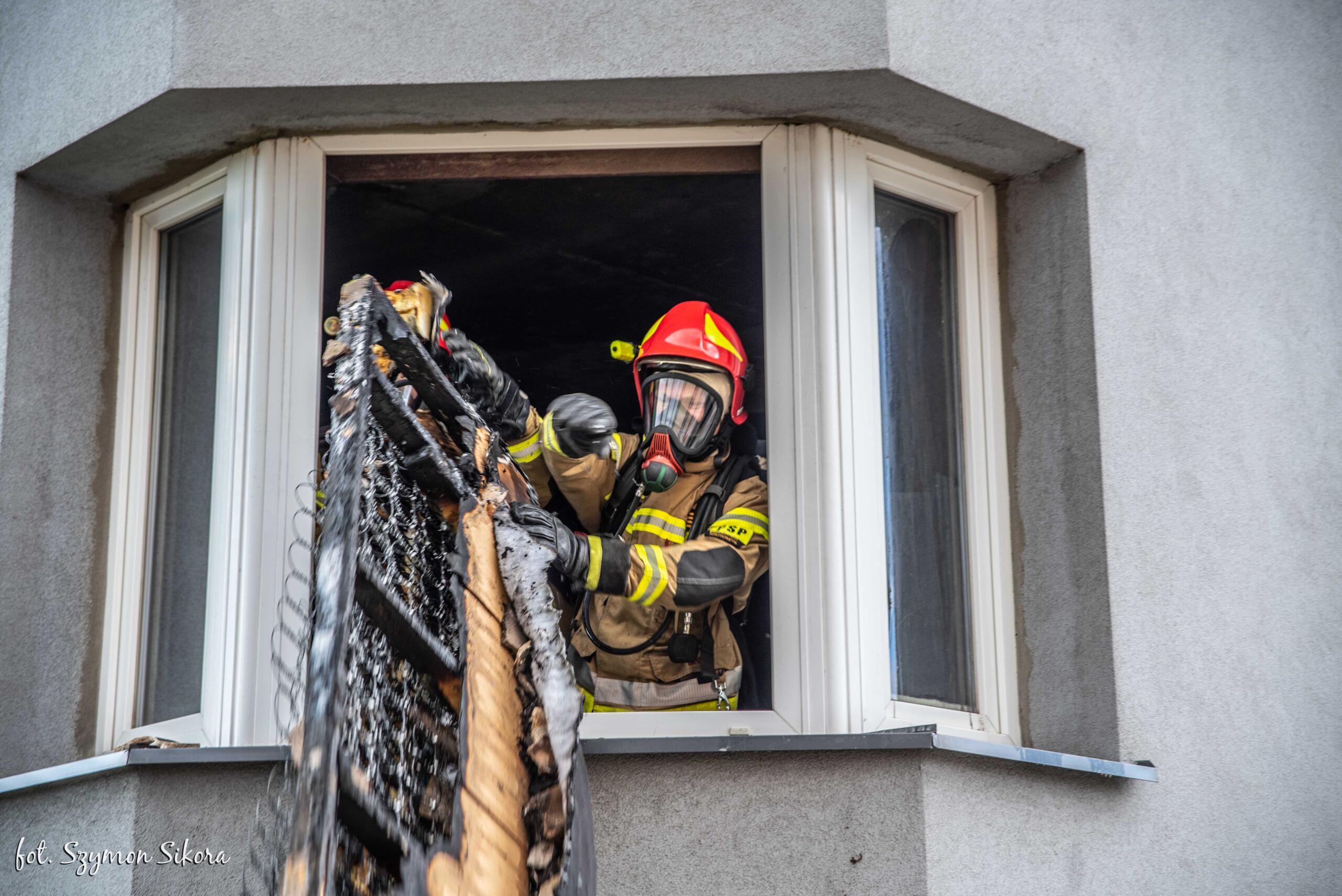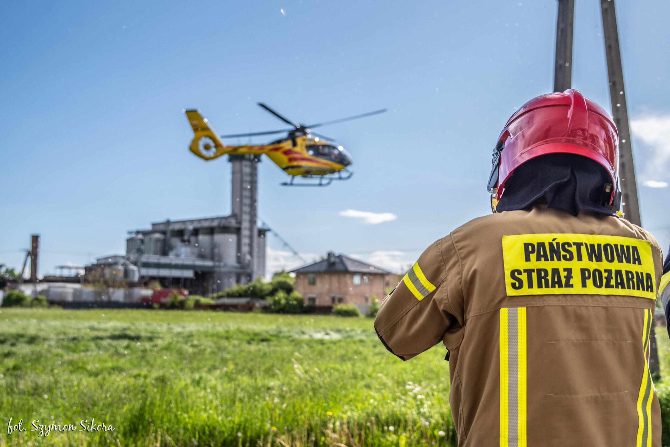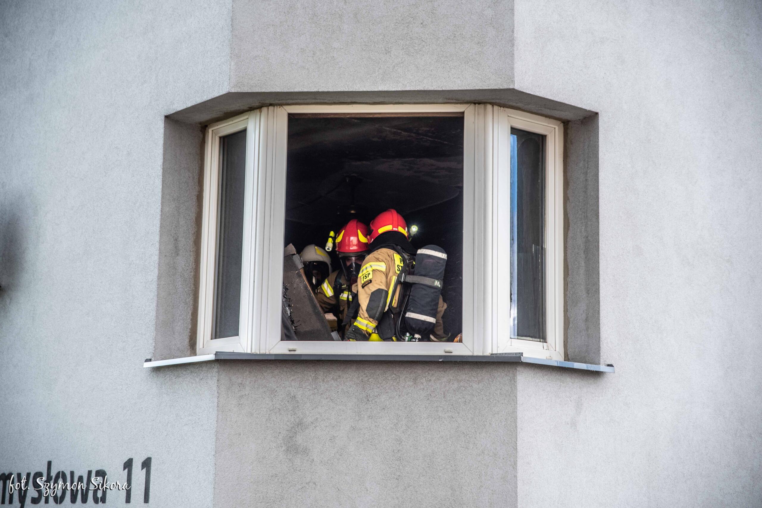 Strażacy po zabezpieczeniu terenu działań przystąpili do natychmiastowej oceny stanu kobiety ewakuowanej ze strefy zagrożenia przez osoby postronne oraz podjęli akcję gaśniczą z użyciem piany sprężonej. Adekwatnie do poniesionych obrażeń lokatorce udzielono kwalifikowanej pierwszej pomocy polegającej na zaopatrzeniu ran oparzeniowych, tlenoterapii biernej oraz wsparciu psychicznym. Po przybyciu karetki pogotowia osoba poszkodowana została przekazana pod opiekę kierownika zespołu, który po dokonaniu oceny stanu uczestniczki zdarzenia podjął decyzję o dyspozycji Lotniczego Pogotowia Ratunkowego celem transportu lokatorki do placówki medycznej. Podjęte działania gaśnicze wewnątrz mieszkania doprowadziły do szybkiej lokalizacji pożaru, który nie rozprzestrzenił się na pozostałą część obiektu. Po stłumieniu ognia strażacy usunęli nadpalone elementy wyposażenia mieszkania na zewnątrz obiektu, które systematycznie dogaszano wodą. Równocześnie z prowadzonymi działaniami gaśniczymi w pobliżu miejsca zdarzenia wyznaczono lądowisko dla śmigłowca, zabezpieczając moment lądowania. Decyzją lekarza lotniczego pogotowia osoba poszkodowana została przetransportowana z miejsca zdarzenia drogą lotniczą do specjalistycznej placówki medycznej.