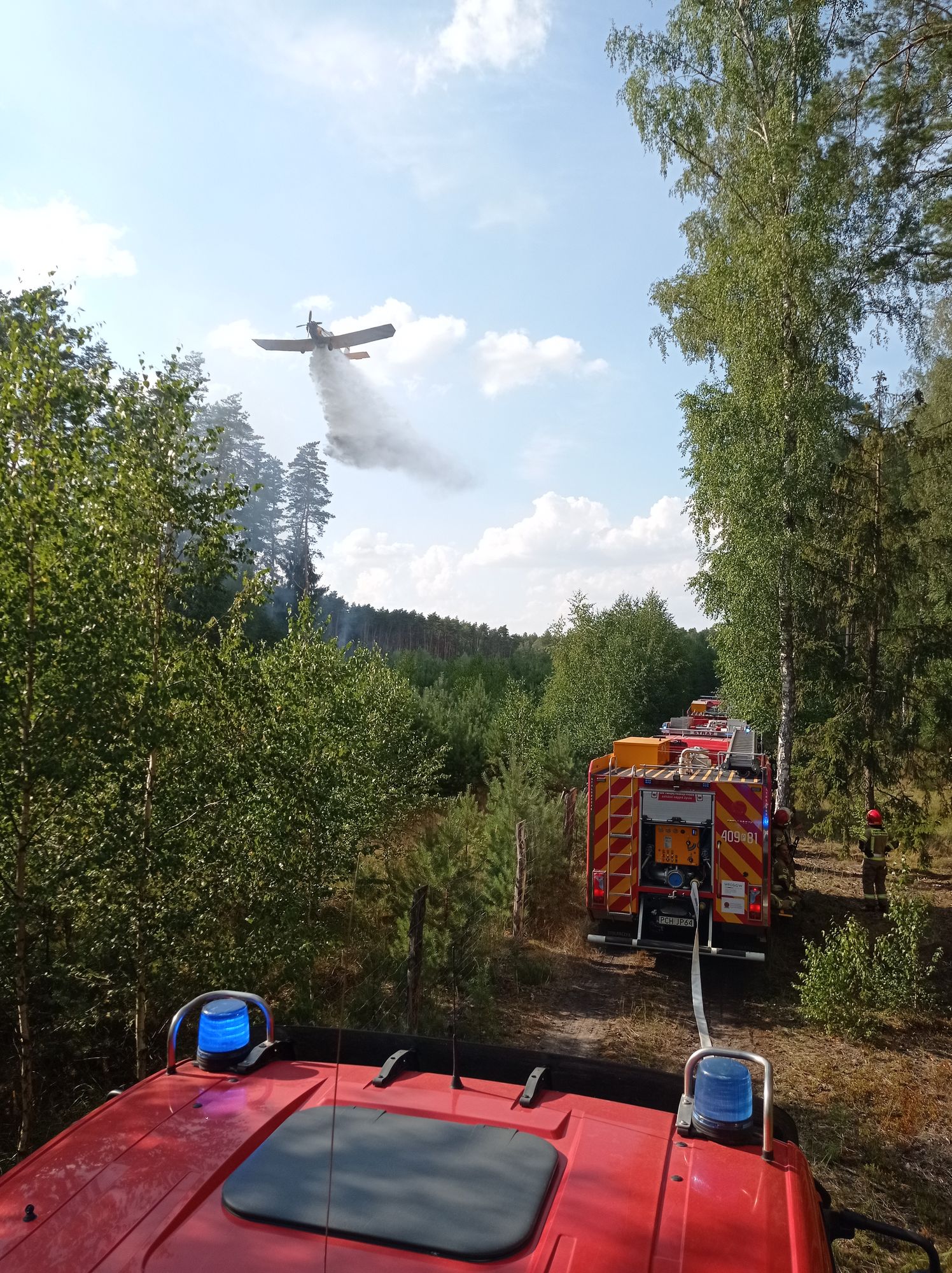 Po przybyciu na miejsce zdarzenia zastępów z straży pożarnej stwierdzono, że pożarem objęte jest prawie pół hektara młodnika –Nadleśnictwo Podanin, Leśnictwo Lipiny. W wyniku pożaru nikt nie został poszkodowany. Działania straży pożarnej w pierwszej kolejności polegały na zabezpieczeniu miejsca zdarzenia i podaniu dwóch prądów wody w natarciu na palący się las. Na miejsce zdarzenia przyleciały dwa samoloty gaśnicze Lasów Państwowych, które dokonały dwa zrzuty wody. Dalsze działania polegały na dogaszaniu pogorzeliska.
