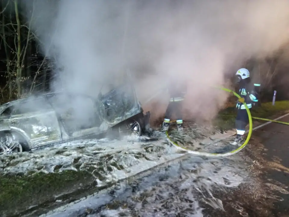 Na miejsce zadysponowano dwa zastępy straży z OSP Kwilcz oraz jeden zastęp zawodowej straży pożarnej z Międzychodu. Po przybyciu rozpoznano, że samochód osoby cały objęty był ogniem. Wyglądało na to, że samochód wypadł z drogi i zaczął się palić. Strażacy zabezpieczyli teren działań i przystąpili do gaszenia pożaru. Z uwagi, że kierowcy niebyło w pobliżu postanowiono przeszukać pobliską okolicę, niestety bezskutecznie.