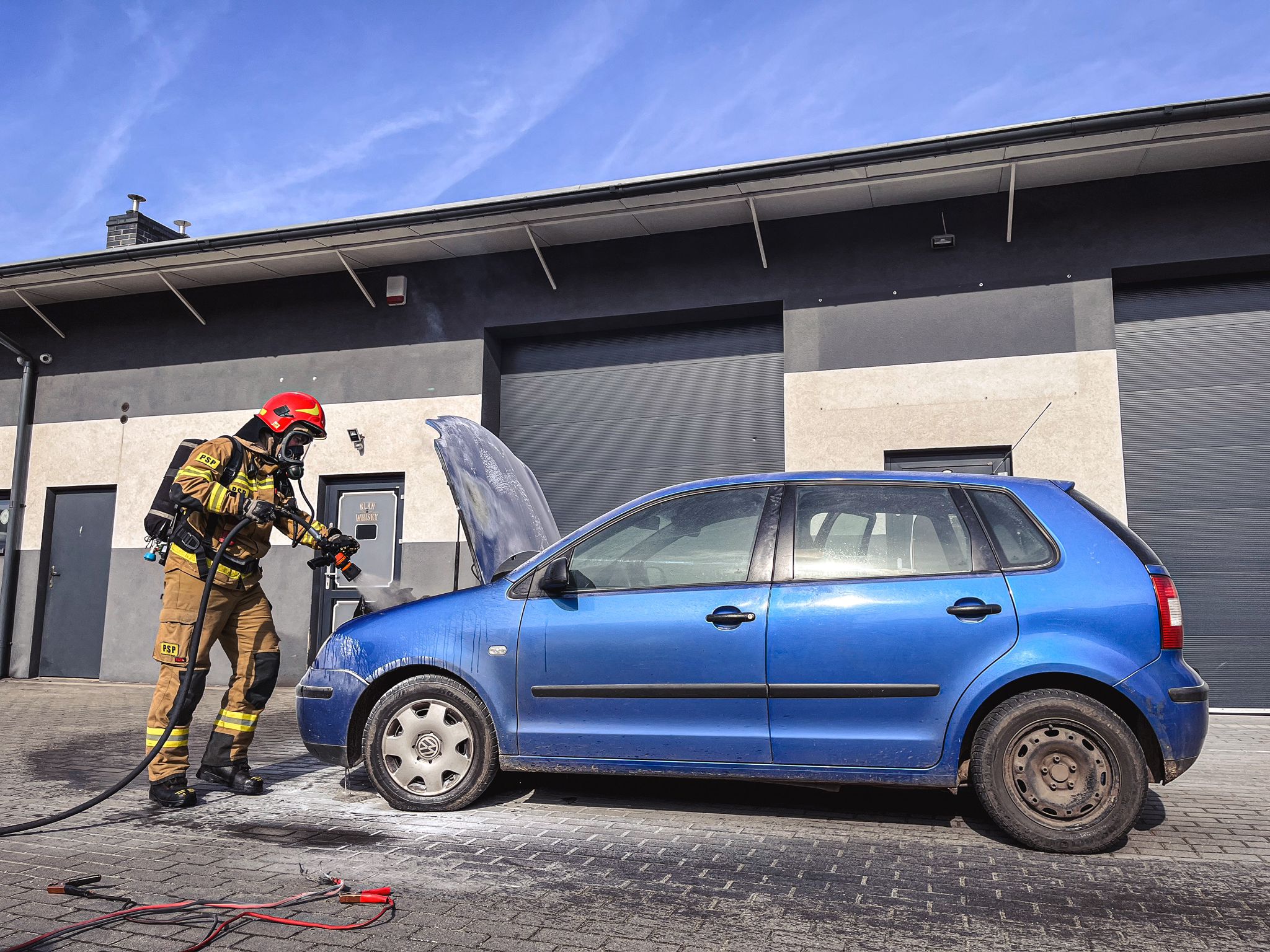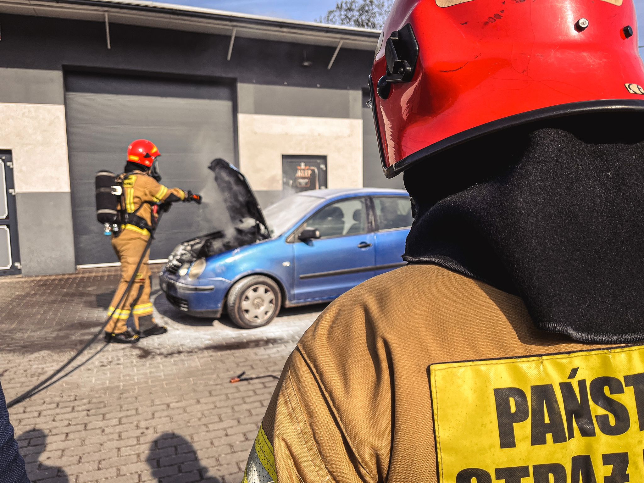 Po przybyciu na miejscu zdarzenia zastępy straży pożarnej zastały pożar komory silnika, który został opanowany przy użyciu gaśnicy proszkowej przez świadków zdarzenia. Strażacy zabezpieczeni w sprzęt ochrony dróg oddechowych podali jeden prąd gaśniczy w celu schodzenia elementów pojazdu. Na miejscu zdarzenia działały trzy zastępy z Jednostki Ratowniczo Gaśniczej w Ostrzeszowie.
