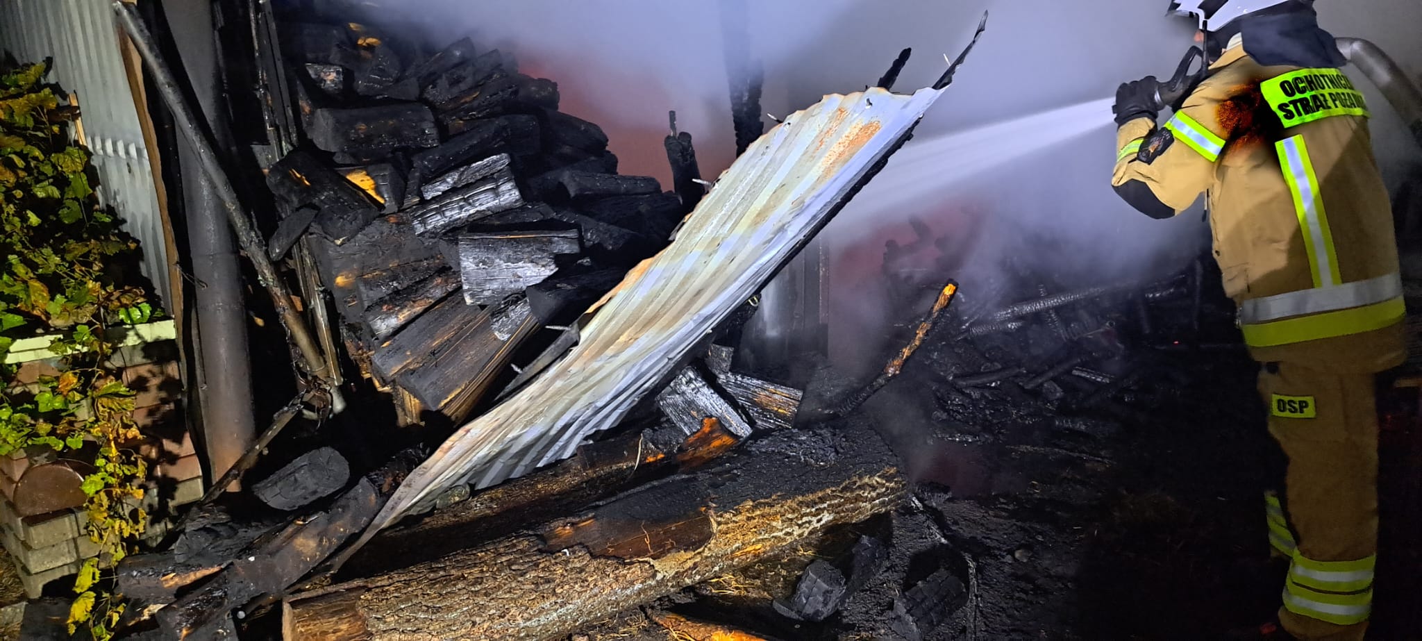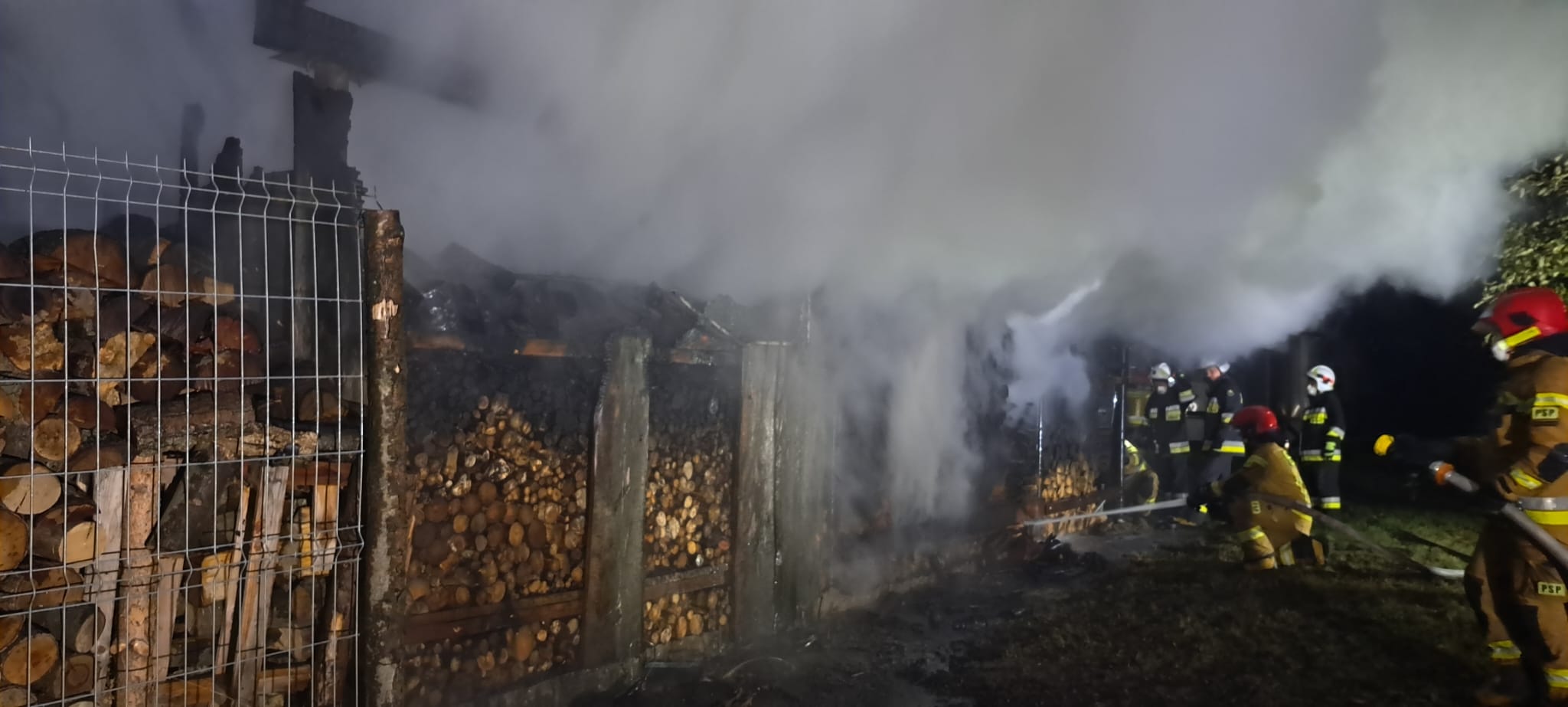 Po przybyciu pierwszych zastępów na miejsce zdarzenia zastano budynek gospodarczy objęty w całości pożarem, który pełnił rolę drewutni i był wypełniony drewnem opałowym.