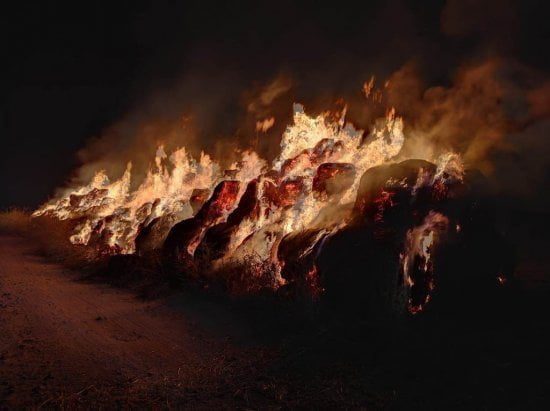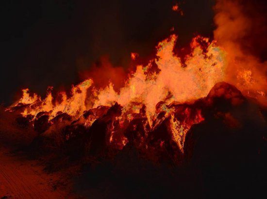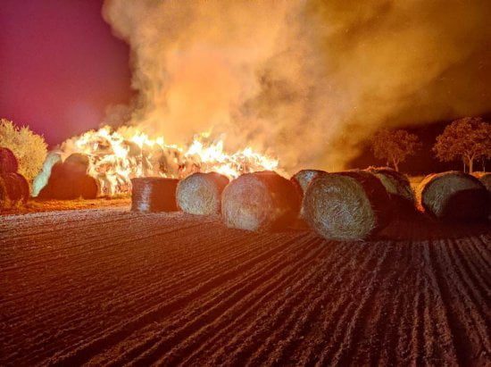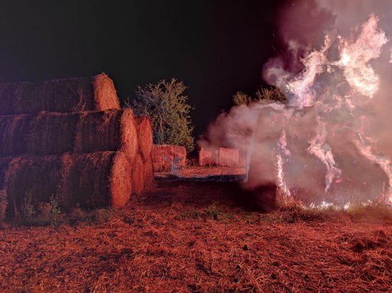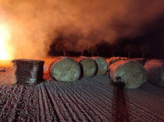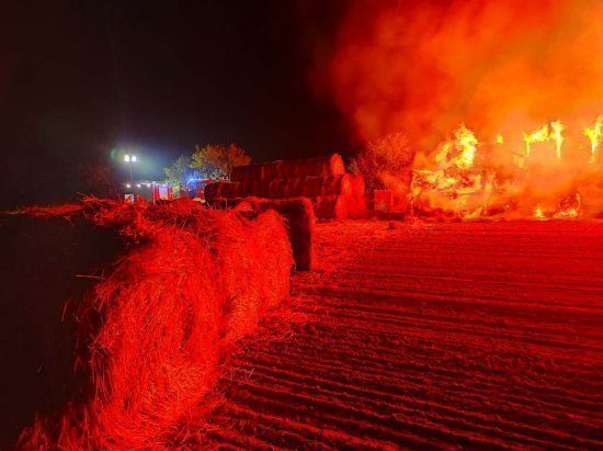 Po dojeździe na miejsce zdarzenia strażacy zastali stóg z balotami słomy, który w połowie objęty był ogniem.