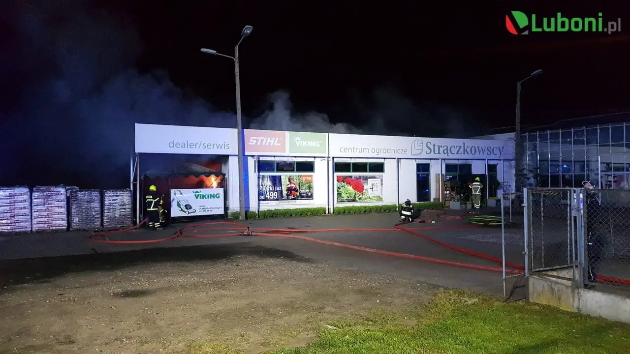 Dnia 5 maja 2020r przed północą w centrum ogrodniczym w Luboniu z niewiadomych przyczyn doszło do pożaru jednego z budynków znajdujących się na terenie obiektu ogrodniczego.