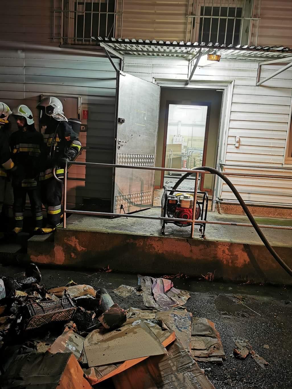 Działania straży pożarnej polegało na zabezpieczeniu miejsca zdarzenia. Strażacy wyposażeni w sprzęt ochrony układu oddechowego weszli do środka budynku i podali prąd gaśniczy piany sprężonej na palące się wyposażenie hali. Podjęte działania gaśnicze doprowadziły do szybkiego opanowania pożaru. Nadpalone wyposażenie hali strażacy wynieśli na zewnątrz i dogasili wodą. Obiekt na bieżąco monitorowano urządzeniami pomiarowymi, które po usunięciu wszystkich materiałów na zewnątrz i oddymieniu pomieszczeń potwierdziły likwidację zagrożenia. Na tym działania zakończono i zastępy wróciły do miejsca stacjonowania.