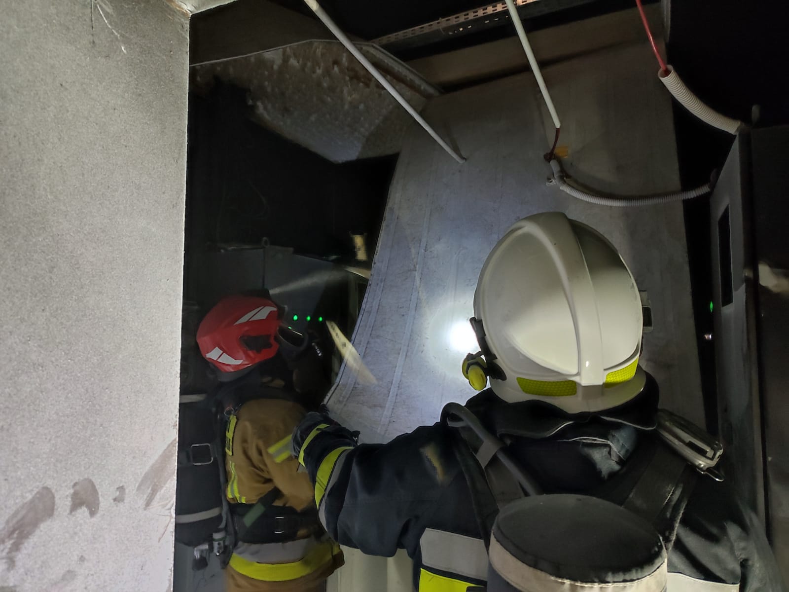 Po odnalezieniu źródła pożaru w celu dotarcia do jego ognisk wykonano prace rozbiórkowe sufitu podwieszonego płytą obornicką. Działania gaśnicze prowadzone były wewnątrz obiektu. W trakcie tych działań podano jeden prąd gaśniczy proszku w natarciu na palące się urządzenie sterujące. Kontrolowano również teren pożaru przy użyciu sprzętu wykrywczo-pomiarowego, po lokalizacji pożaru prowadzono przeszukiwanie pomieszczeń obiektu pod kątem potencjalnych zagrożeń.