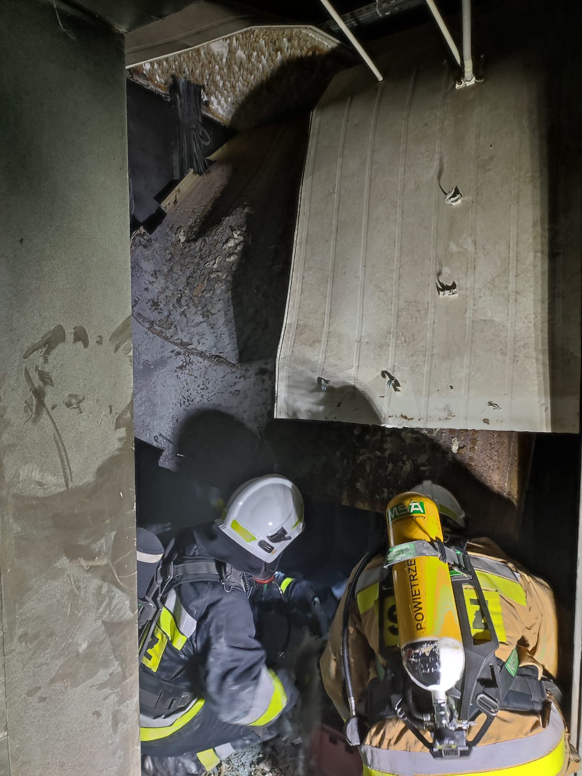 Po dotarciu jednostek na miejsce okazało się, że panuje bardzo duże zadymienie zarówno na parterze, jak i na poddaszu hali zakładu. W pierwszej fazie działań trudność strażakom sprawiło samo zlokalizowanie źródła pożaru w skomplikowanym układzie pomieszczeń. Jak ustalono paliło się niewielkich rozmiarów pomieszczenie techniczne oraz znajdujące się w nim urządzenia i instalacja sterująca procesem technologicznym. Zadymienie rozeszło się do innych części hali instalacją wentylacyjną.