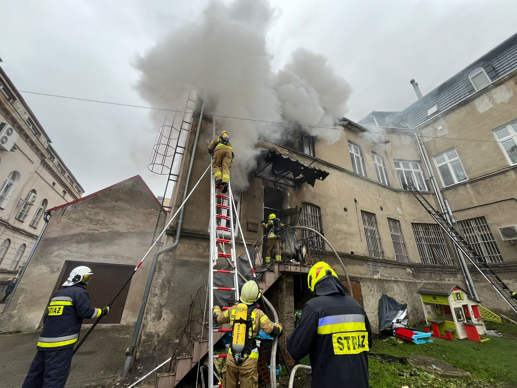 Po przybyciu zastępów straży pożarnej na miejsce zdarzenia zastano rozwinięty pożar w budynku mieszkalnym. W mieszkaniu na 3 kondygnacji pozostawała kobieta i jej trójka dzieci którym płomienie uniemożliwiły drogę ucieczki. Przed budynkiem znajdował się mężczyzna który przed przybyciem służb ratowniczych próbował dostać się do mieszkania ale niestety bezskutecznie. Pozostali lokatorzy ewakuowali się z budynku przed przybyciem służb ratowniczych.
