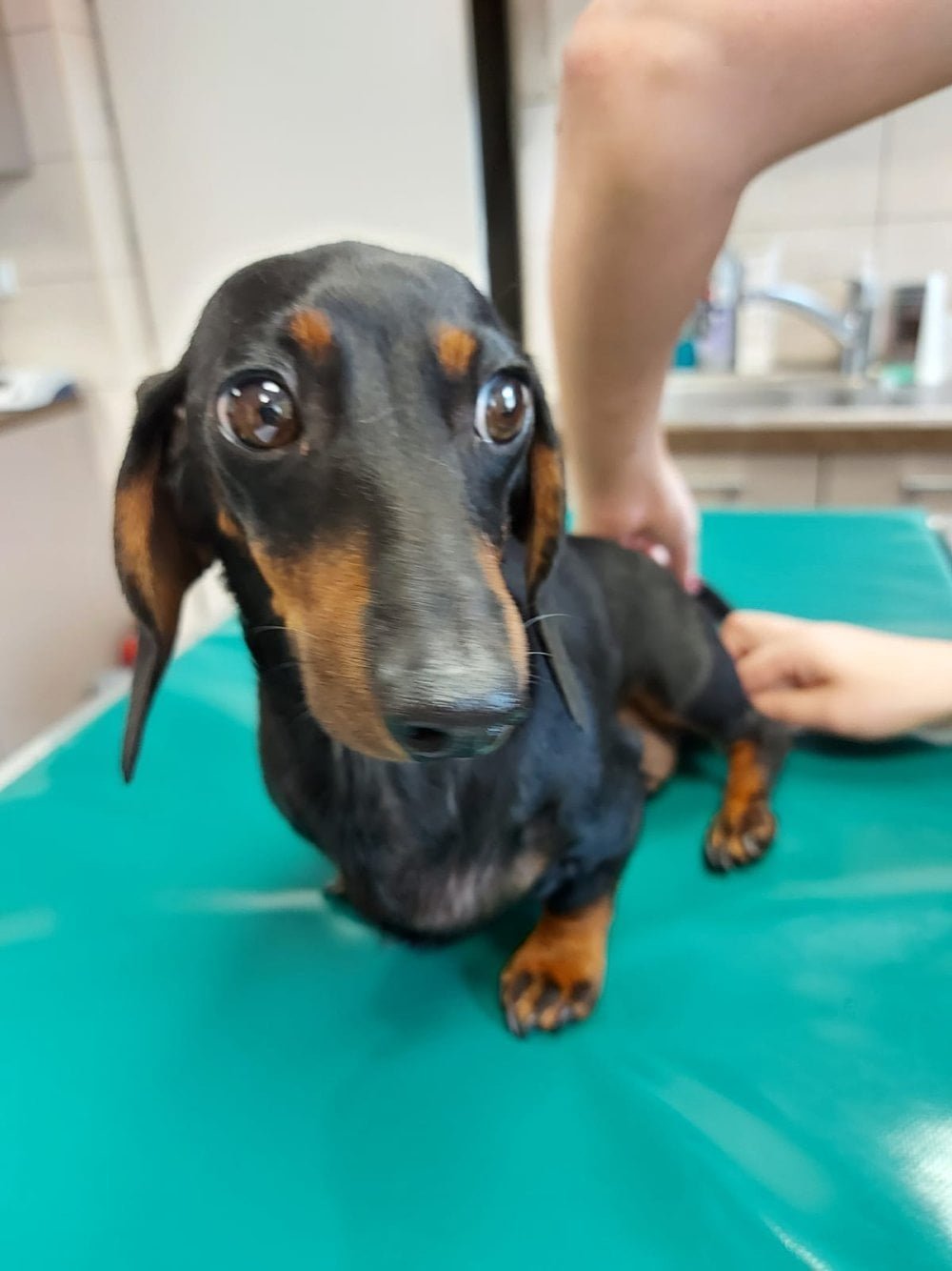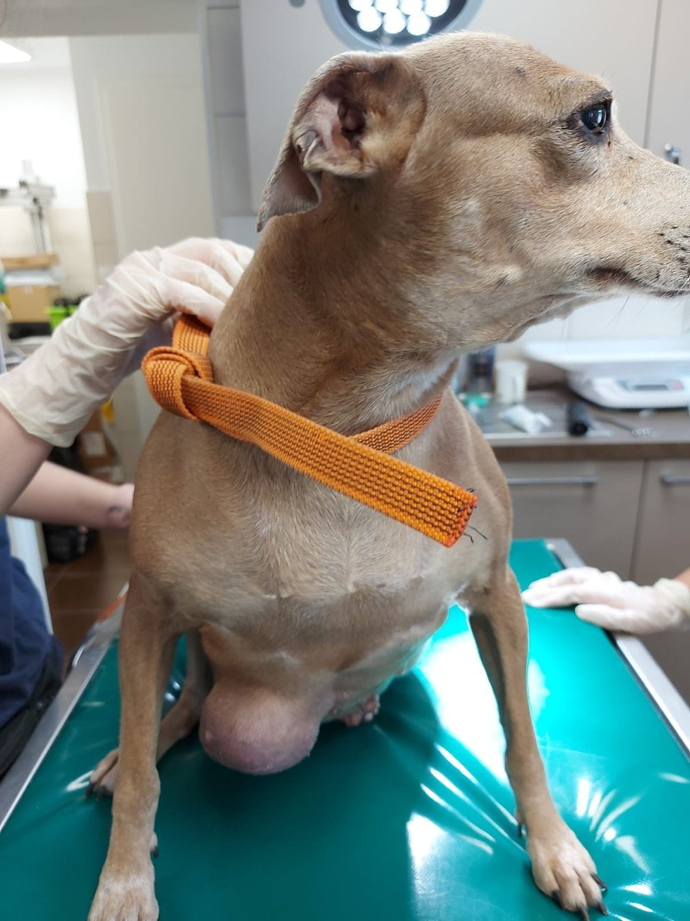 Opowiada o chorobach ortopedycznych, o cesarskim cięciu, które wykonano kilka lat temu, ale nie potrafi odpowiedzieć, dlaczego psiak nie był na kontroli po zabiegu i nie ściągnięto mu szwów.