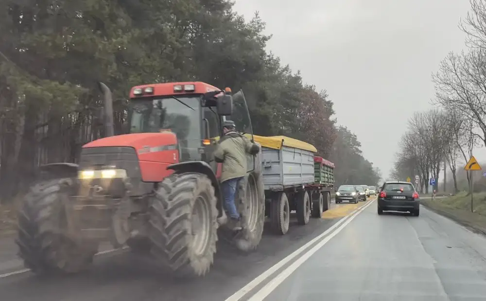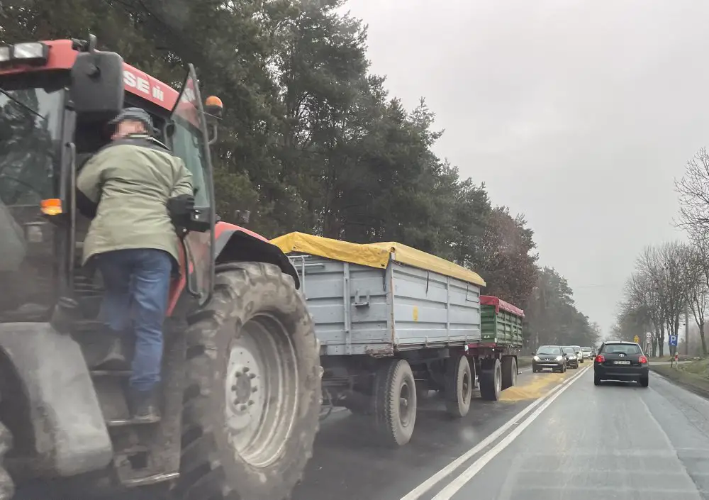 Na drogę w okolicach Drzymałowa wysypało się zborze, które wiózł rolnik ciągnąc przyczepy traktorem.