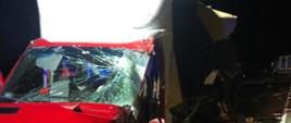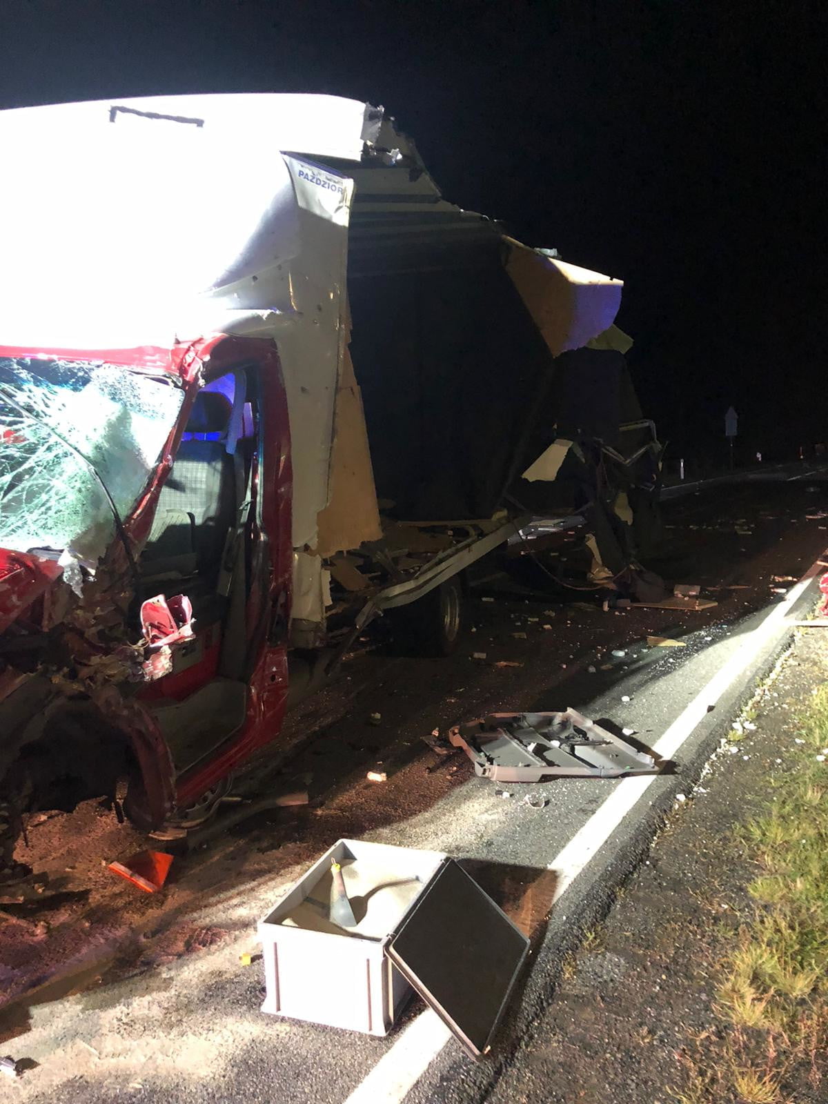 Po dotarciu na miejsce zdarzenia strażaków stwierdzono wypadek ciągnika siodłowego z dostawczym busem. W wyniku zderzenia 19-letni kierowca busa wymagał pomocy medycznej. Koniecznie było wprowadzenie ruchu wahadłowego.