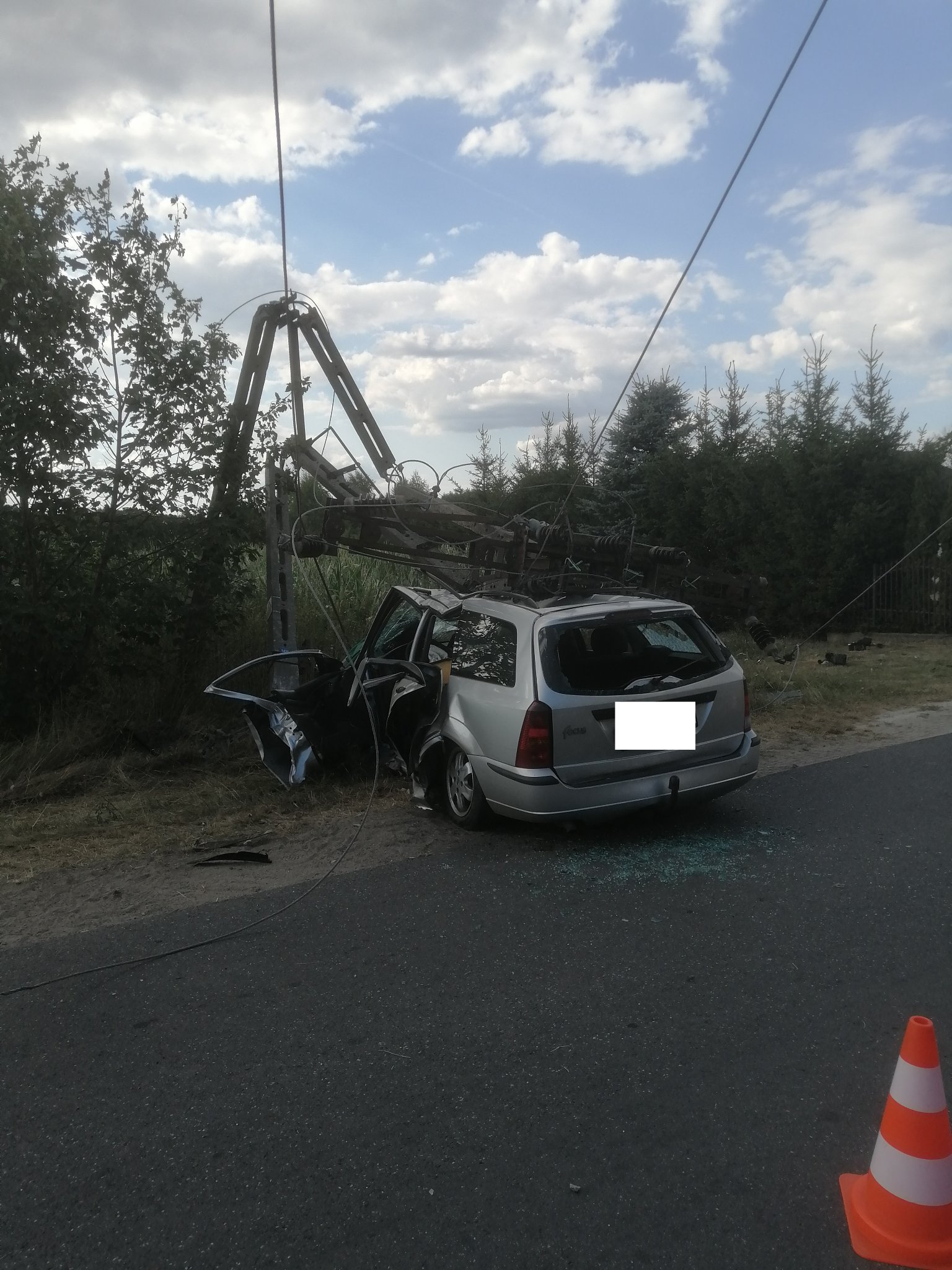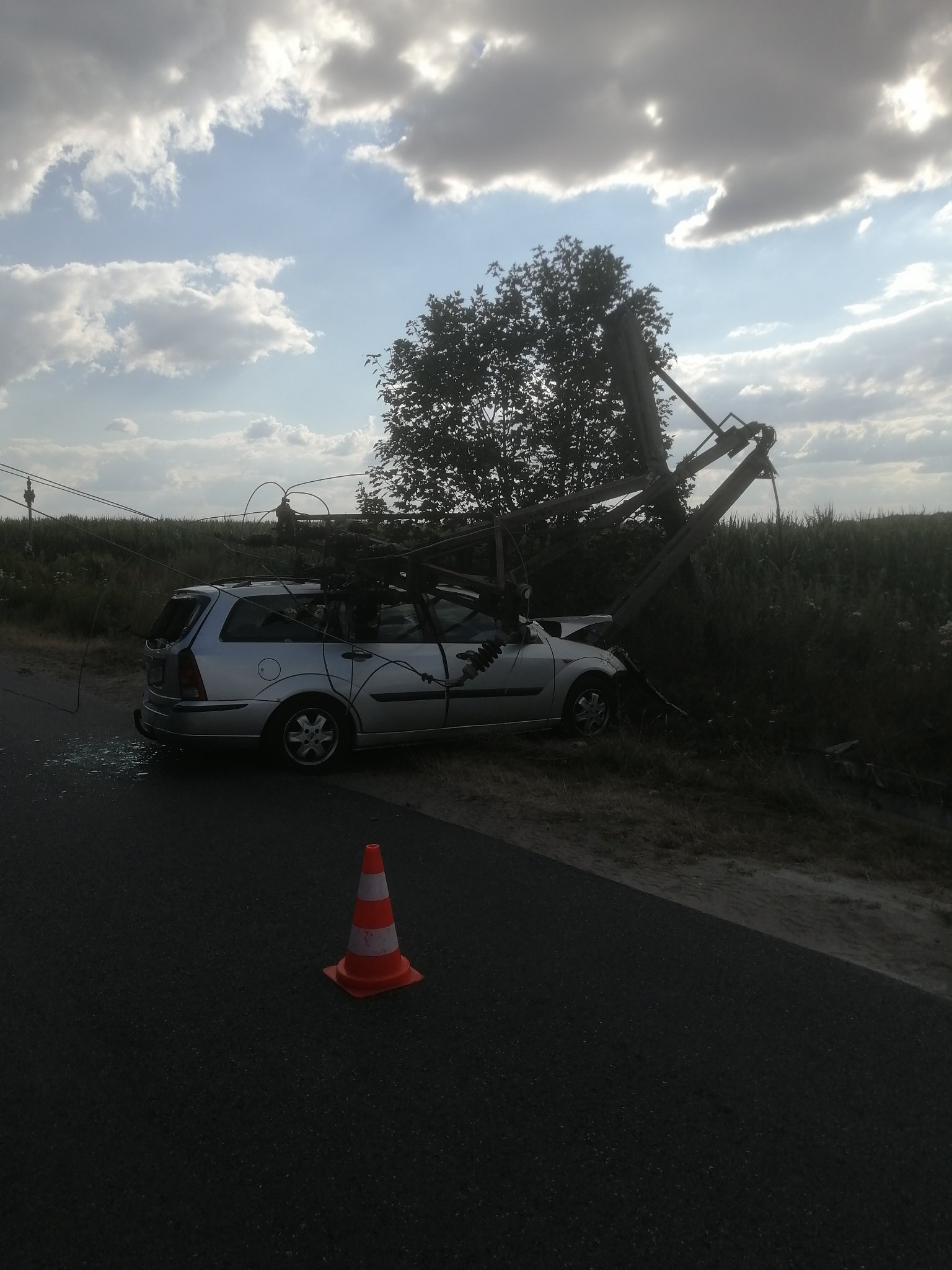 Strażacy po dotarciu na miejsce zastali samochód osobowy, który uderzył w słup z linią energetyczną, a poszkodowany był zakleszczony w pojeździe. Działania strażaków polegały na zabezpieczeniu miejsca zdarzenia, wykonania dostępu do osoby poszkodowanej i udzielenia jej Kwalifikowanej Pierwszej Pomocy.