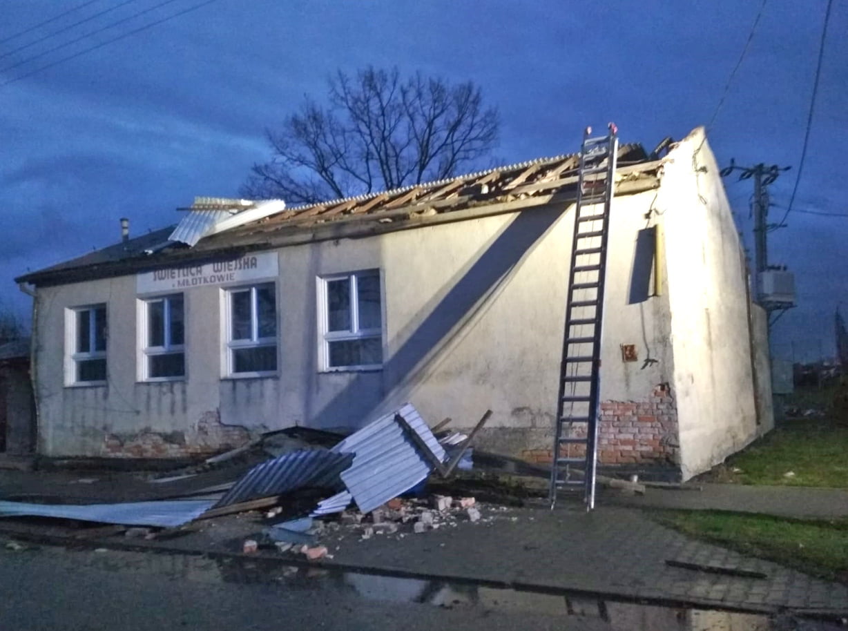 Najtrudniejsza sytuacja wystąpiła w miejscowości Młotkowo (gm. Wysoka), gdzie wiatr zerwał dach nad budynkiem sali wiejskiej. Na miejscu przez 8 godzin pracowało 23 strażaków, zabezpieczając mienie zgromadzone wewnątrz i zabezpieczając plandekami uszkodzony obiekt.