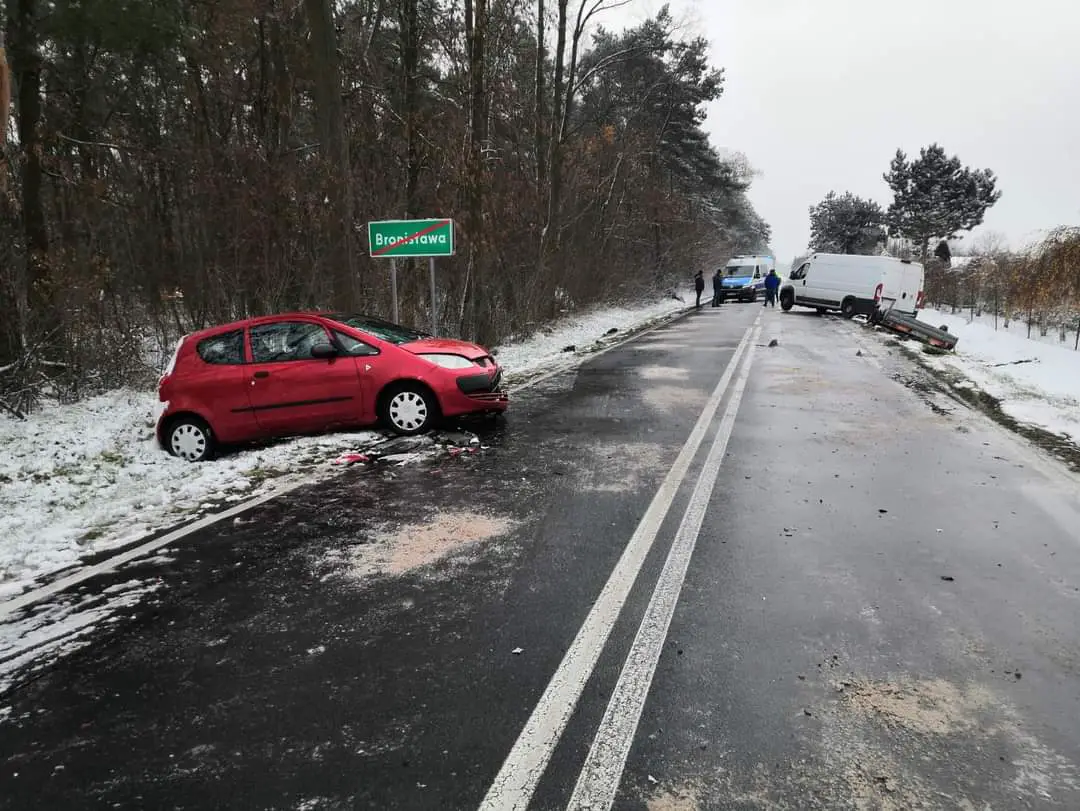 W następstwie tego uderzenia przyczepka została przepchnięta na przeciwległy pas ruchu i uderzyła w jadący z przeciwka samochód mitsubishi, którym kierował 35-letni mężczyzna. Na miejsce wezwano pogotowie. 35-latek z gm. Sompolno został zabrany do szpitala w Koninie.
