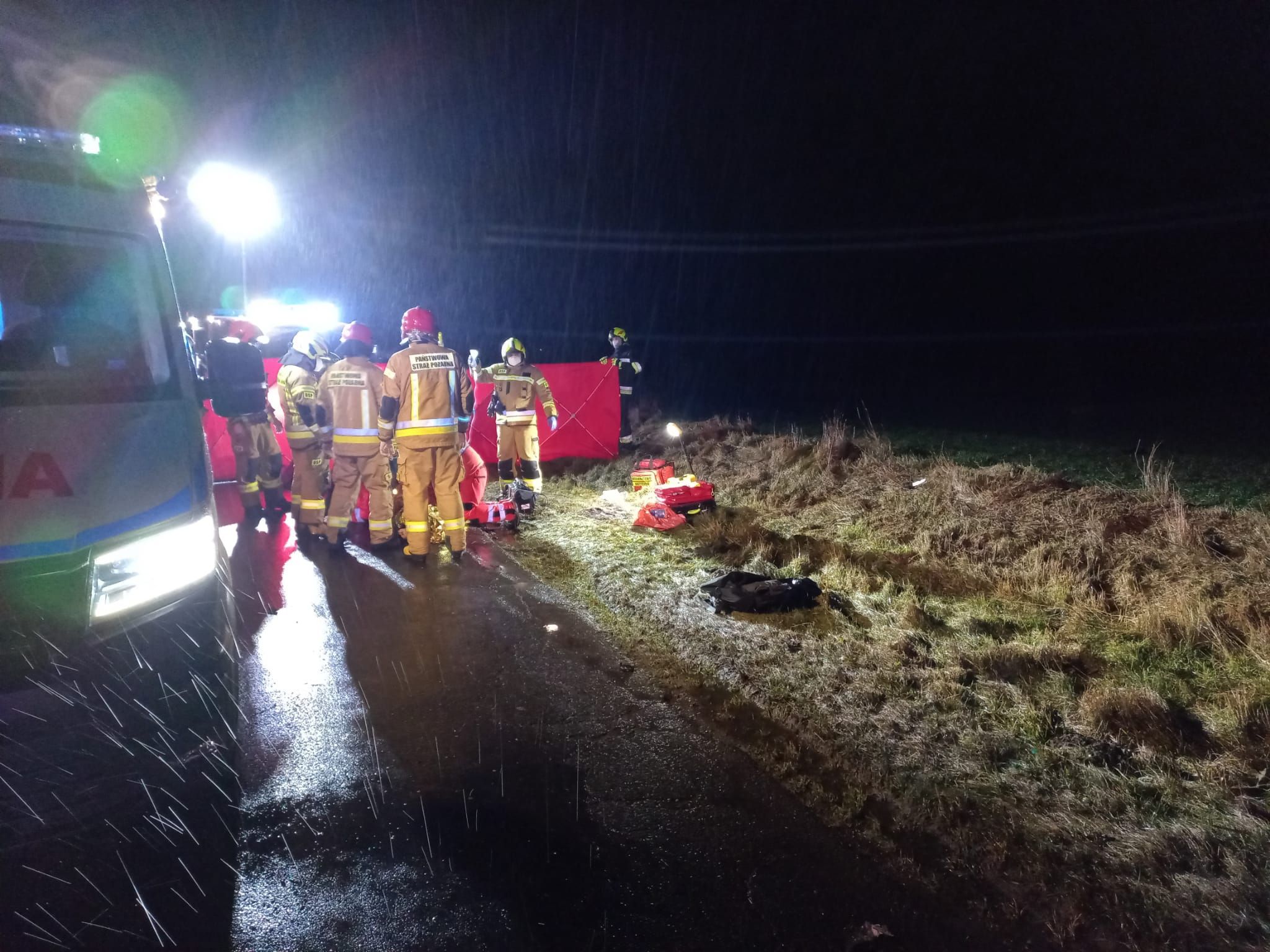 W momencie przybycia strażaków na miejsce wypadku świadkowie zdarzenia prowadzili Resuscytację Krążeniowo – Oddechową, która była instruowana telefonicznie przez dyżurnego SKKP. Działania strażaków polegały na zabezpieczeniu miejsca zdarzenia, oświetleniu terenu akcji, odłączeniu akumulatora w samochodzie osobowym oraz udzieleniu potrąconemu mężczyźnie kwalifikowanej pierwszej pomocy (tamowanie krwotoku z lewej kończyny dolnej – amputowana stopa, kontrola ABC, dalsze prowadzenie Resuscytacji Krążeniowo – Oddechowej, podłączenie defibrylatora AED, termoizolacja). Kierowcy samochodu osobowego zapewniono wsparcie psychiczne oraz termoizolację, a przybyły na miejsce ratownik medyczny nie stwierdził konieczności zabrania kierowcy do szpitala.