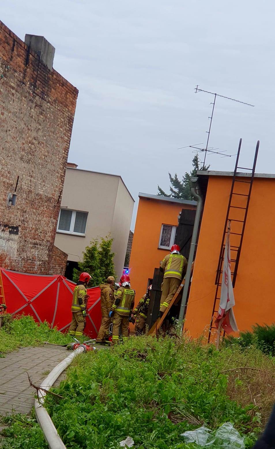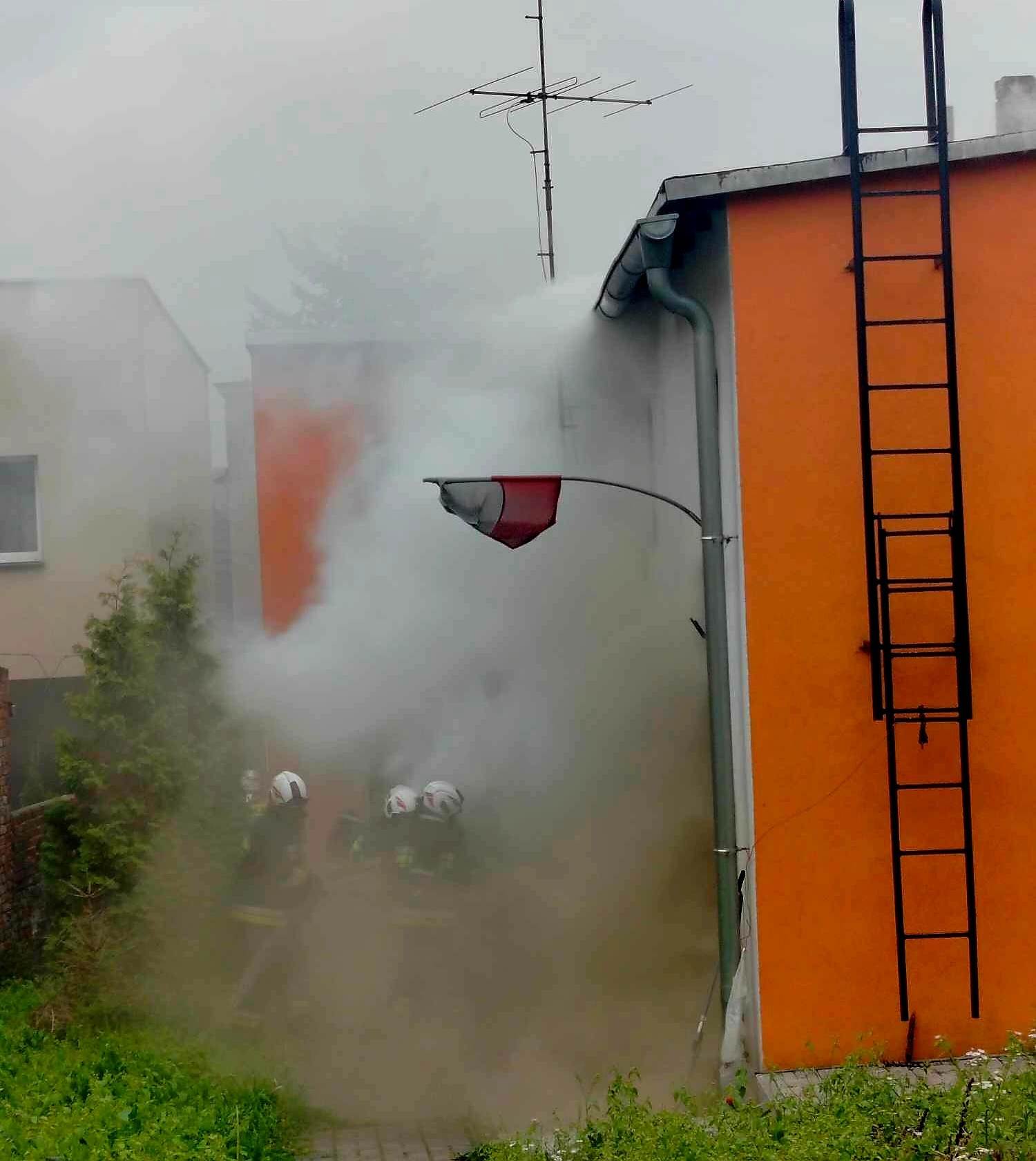 Po dojeździe na miejsce zdarzenia strażacy zastali budynek mieszkalny i część poddasza, który objęty był ogniem. Strażacy uzyskali informację od sąsiadów, że w mieszkaniu może znajdować się lokatorka oraz pies.