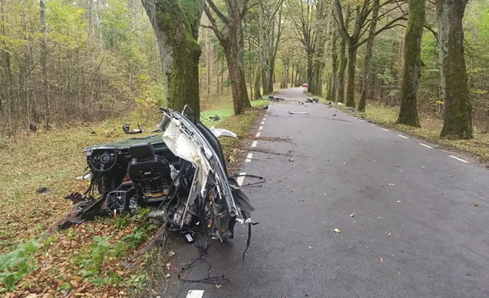Kierujący audi na zakręcie stracił panowanie and kierownicą. Rozpędzony samochód uderzał w przydrożne drzewa. Siła uderzeń była tak potężna, że audi rozpadło się na kawałki.
