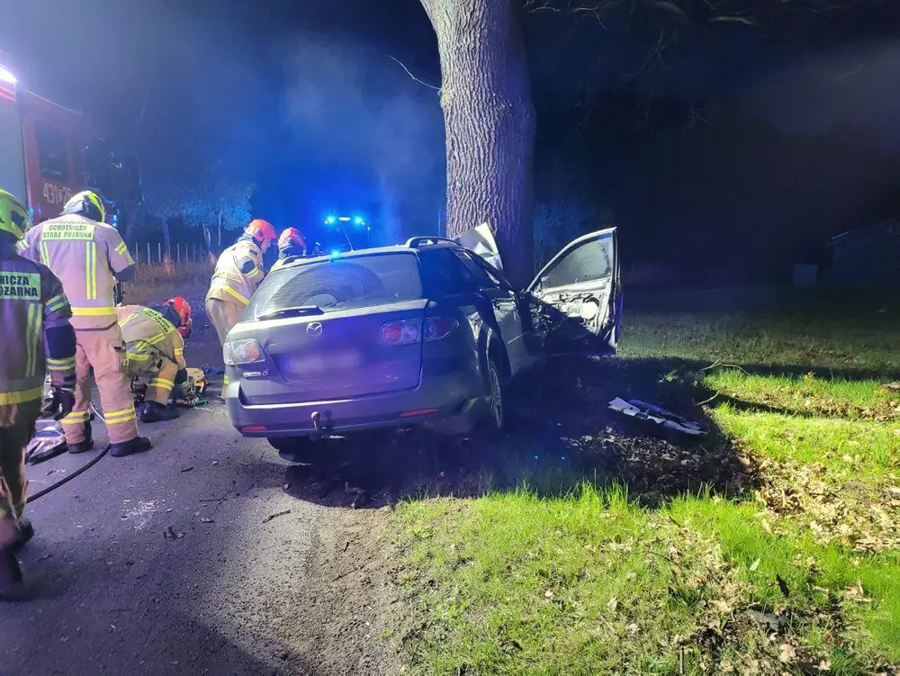 Po dojeździe pierwszego zastępu straży pożarnej na miejsce, kierujący działaniem ratowniczym potwierdził zdarzenie. Kierujący mazdą z dużą siłą uderzył w drzewo.