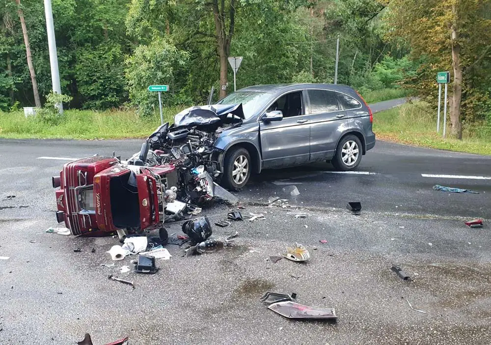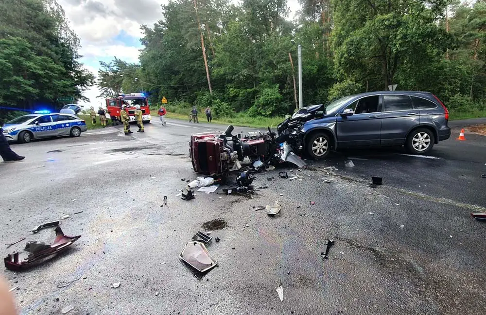 Motocyklista zderzył się z hondą. Siła zderzenia była potężna, Motor został niemal kompletnie rozbity. Na miejsce wypadku szybko dojechały służby ratunkowe.