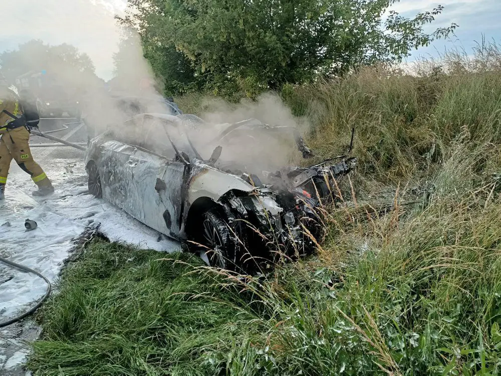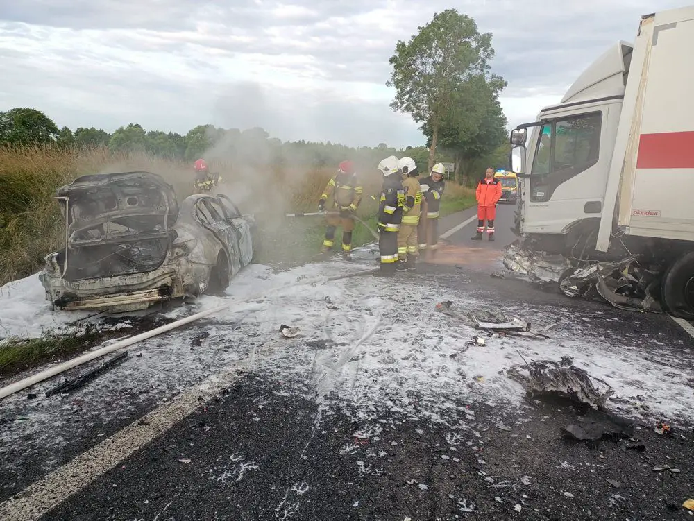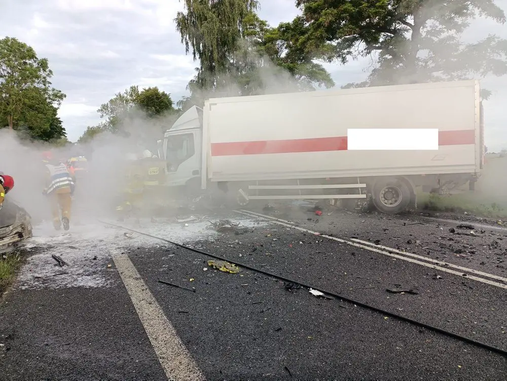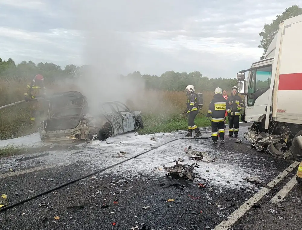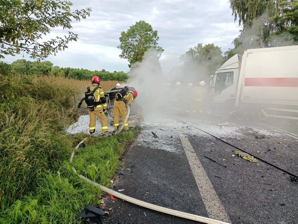 Po zderzeniu z ciężarówką samochód osoby zapalił się. Pojazd spłonął doszczętnie. Niestety dwie osoby z osobówki zginęły na miejscu.