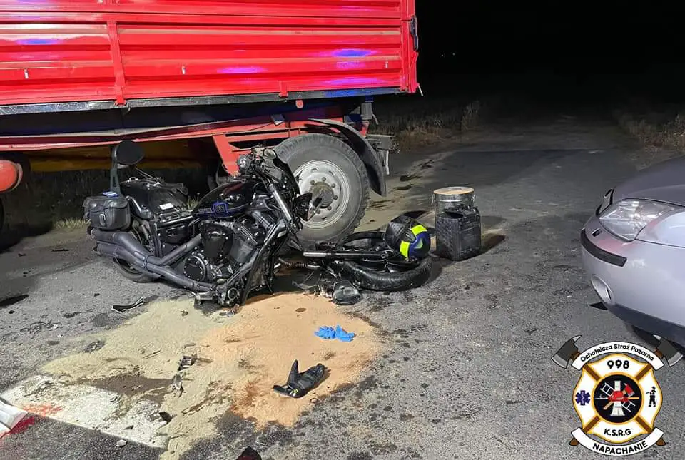 Kierujący motocyklem około 40-letni motocyklista uderzył w przyczepę rolniczą. Niestety pomimo szybkiej pomocy. Na skutek odniesionych obrażeń motocyklista zmarł.
