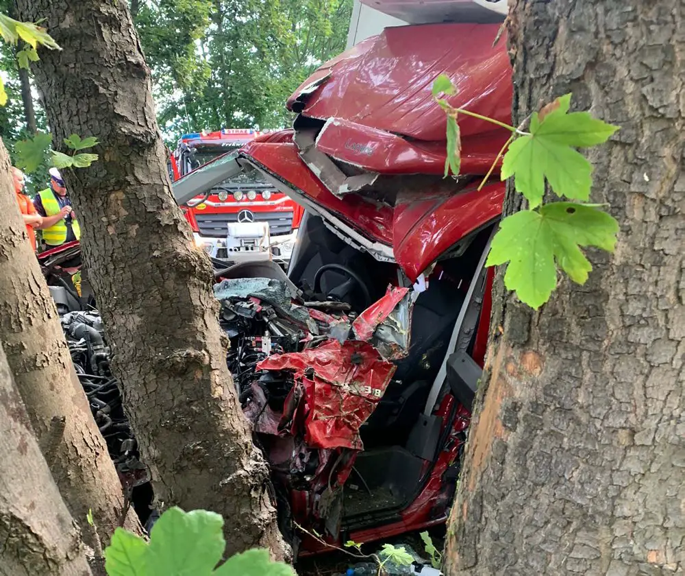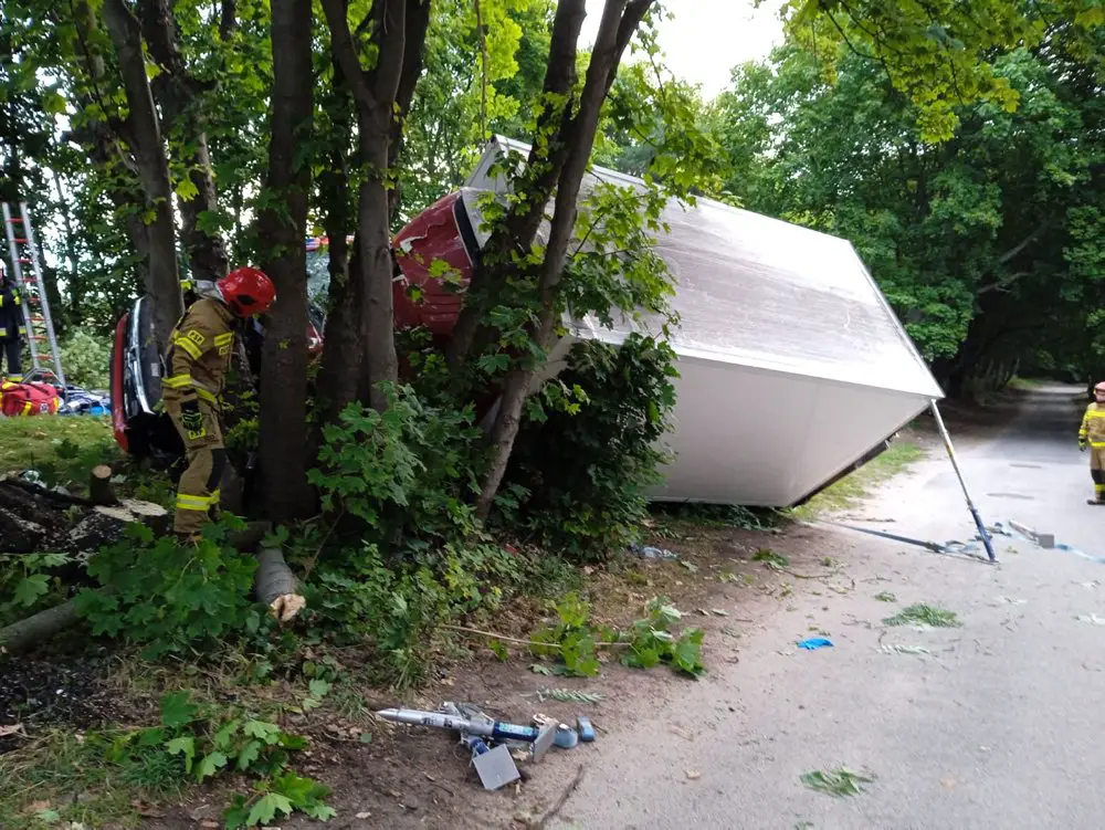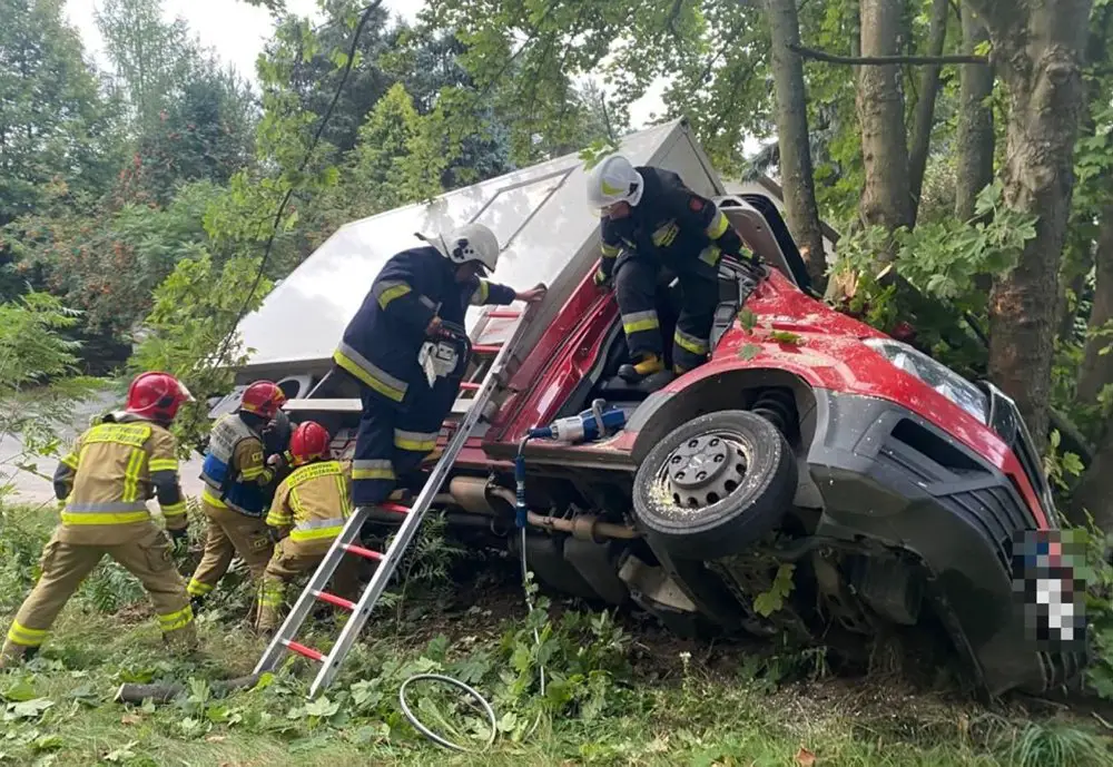 Siła uderzenia w drzewo była tak duża, że kierowca został zakleszczony w kabinie. Mężczyzn sprzętem hydraulicznym wcinali strażacy.