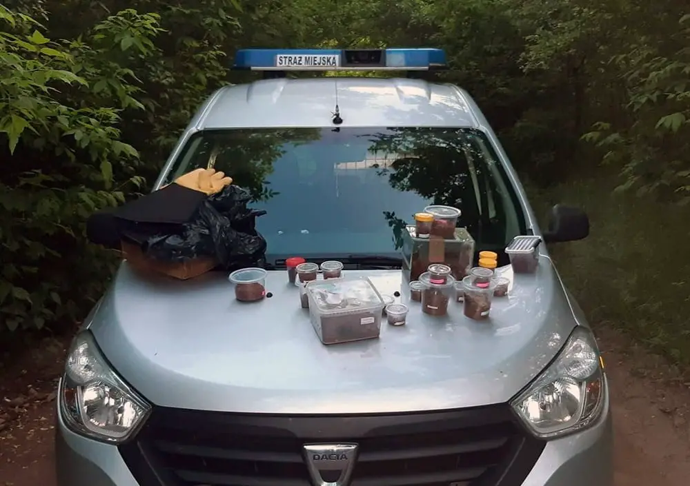 Pojemniki z pająkami znalazł mieszkanka Mosiny (woj. wielkopolskie) podczas spaceru. Na miejsce została wezwana straż miejska.