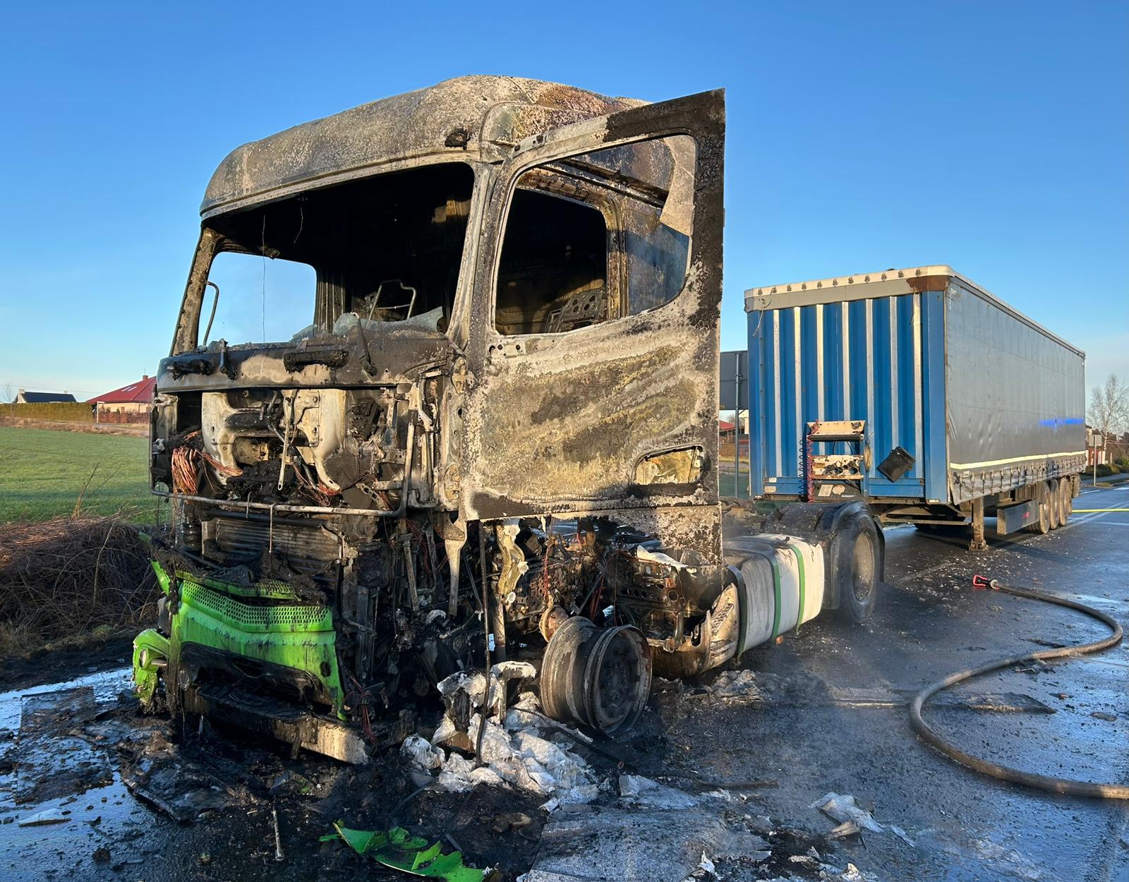 Po dojeździe na miejsce zdarzenia strażacy zastali ciągnik siodłowy, który cały objęty był ogniem. Naczepa od pojazdu została rozłączona przez kierowcę.