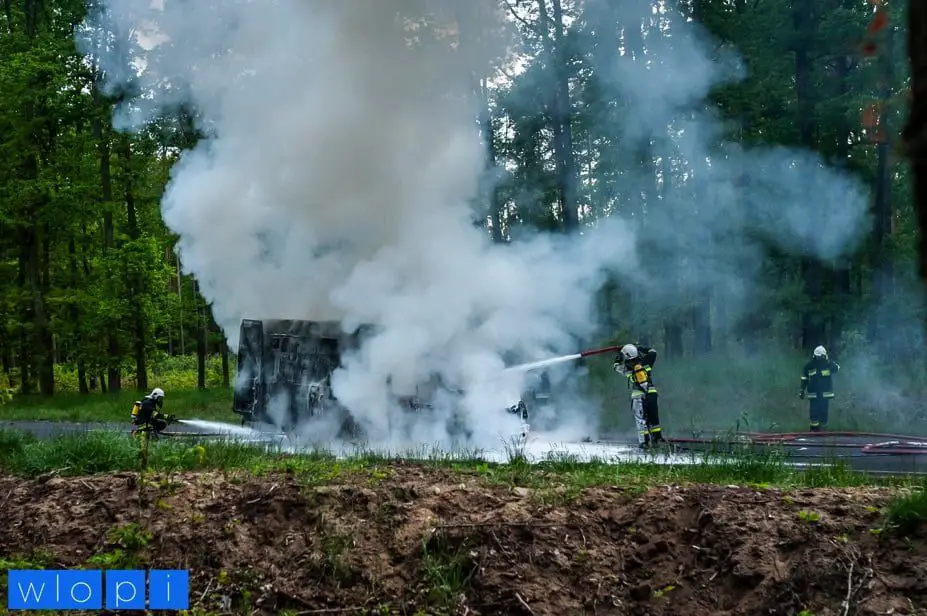 Z uwagi na charakter zgłoszenia do działań zadysponowano zastęp z Jednostki Ratowniczo Gaśniczej PSP Leszno oraz Ochotniczej Straży Pożarnej we Włoszakowicach. Po dotarciu na miejsce zdarzenia zabezpieczono teren działań. W wyniku przeprowadzonego rozpoznania ustalono, że pojazd całkowicie jest objęty pożarem. Strażacy z pierwszej przybyłej jednostki, zabezpieczeni w aparaty izolujący drogi oddechowe, na palący się pojazd podali prąd piany gaśniczej, czym skutecznie stłumiono ogień. Po usunięciu z części bagażowej pojazdu przewożonego towaru i zdemontowaniu niezbędnych elementów karoserii, sprawdzono skuteczność działań gaśniczych. Do pożaru doszło wskutek kolizji pojazdu z jeleniem. Rannym jeleniem zajął się przy były na miejsce zdarzenia myśliwy.