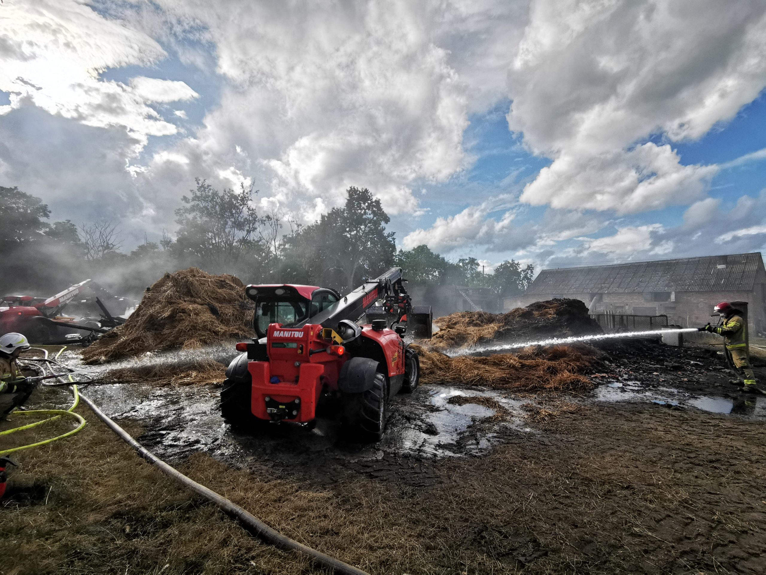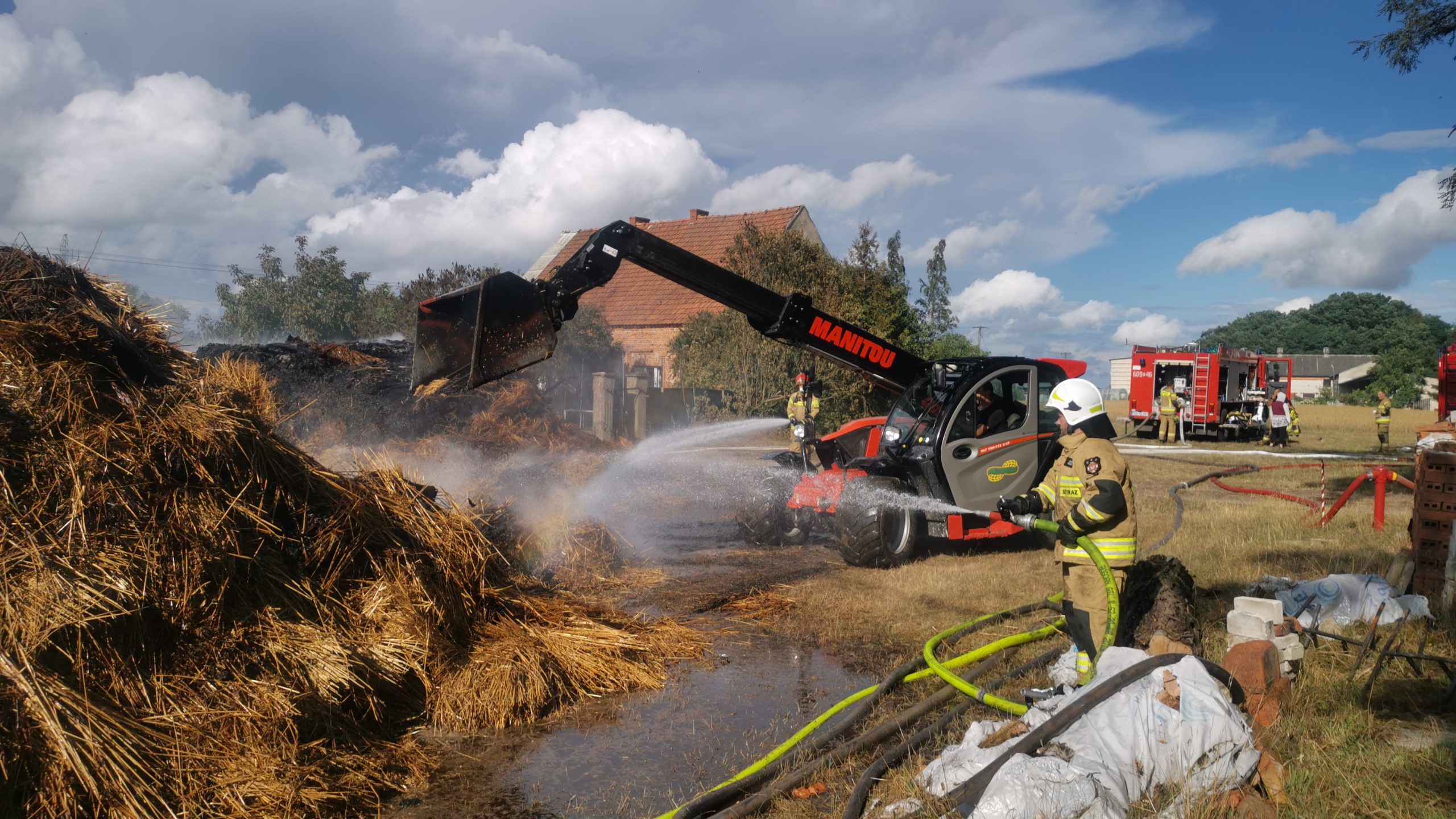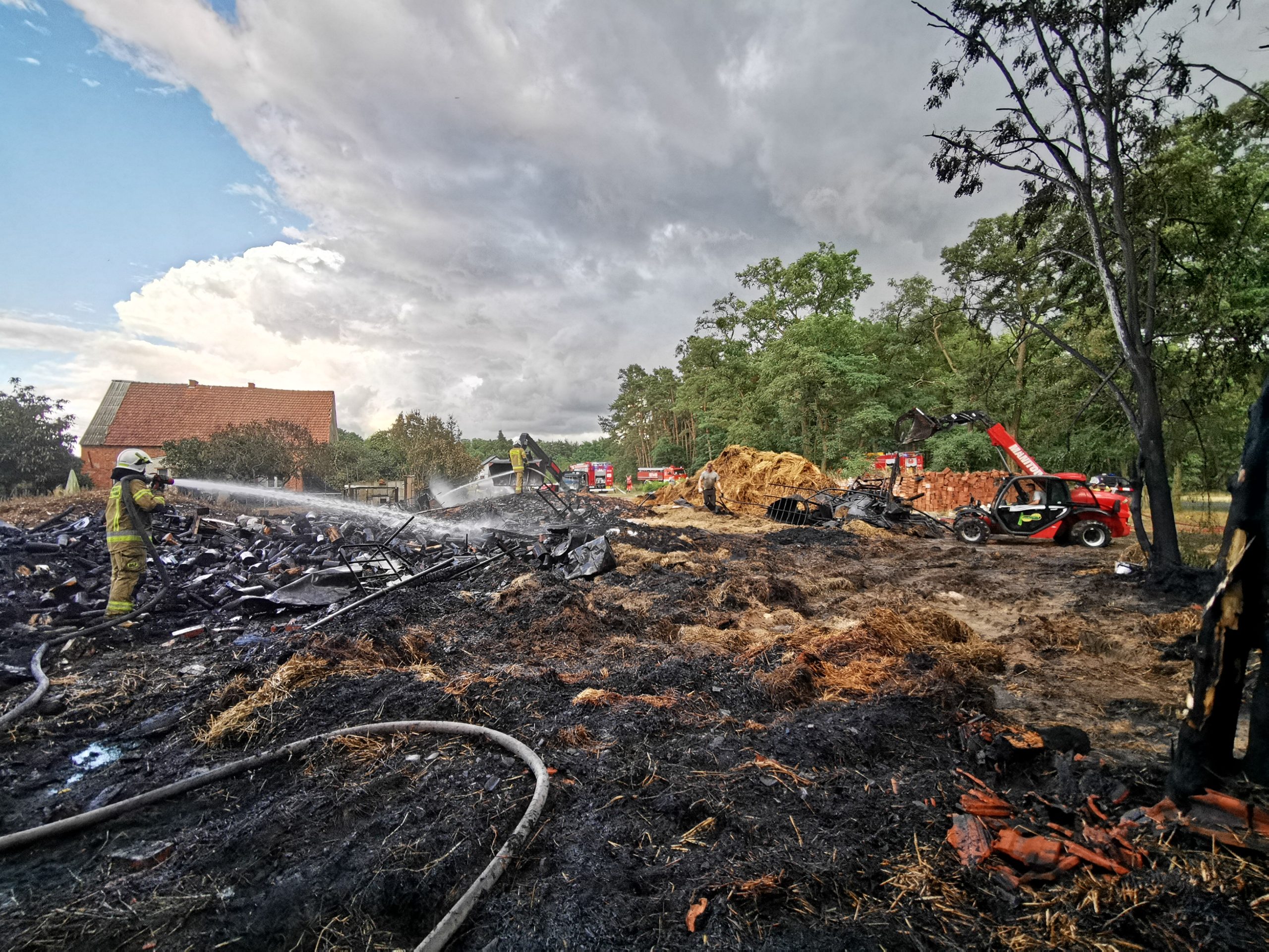 Do zadań przybyłych na miejsce ratowników, należało zabezpieczenie miejsca zdarzenia oraz podanie ośmiu prądów wody w natarciu na palące się elementy stodoły i przyległych budynków gospodarczych przez zabezpieczonych strażaków w środki ochrony indywidualnej. Pożar został opanowany przy współpracy zarówno strażaków jak i lokalnych mieszkańców – przez operatorów koparko-ładowarek, którzy sukcesywnie przerzucali tlący się materiał palny: słomę, siano, zboże oraz maszyny rolnicze. W trakcie prowadzonych działań doszło również do niewielkiego pożaru na strychu budynku mieszkalnego, który został szybko opanowany.