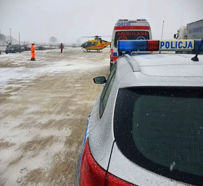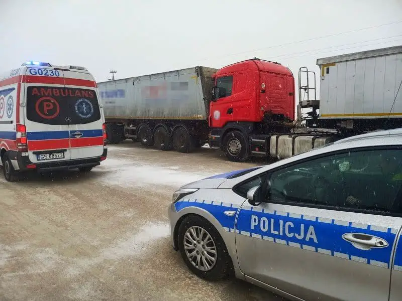 Bytowscy policjanci wyjaśniają okoliczności wypadku, do którego doszło w gminie Lipnica (woj. pomorskie). Ciężarowy scania przygniotła mężczyznę do innej ciężarówki. Ranny mężczyzna śmigłowcem LPR trafił do szpitala.
