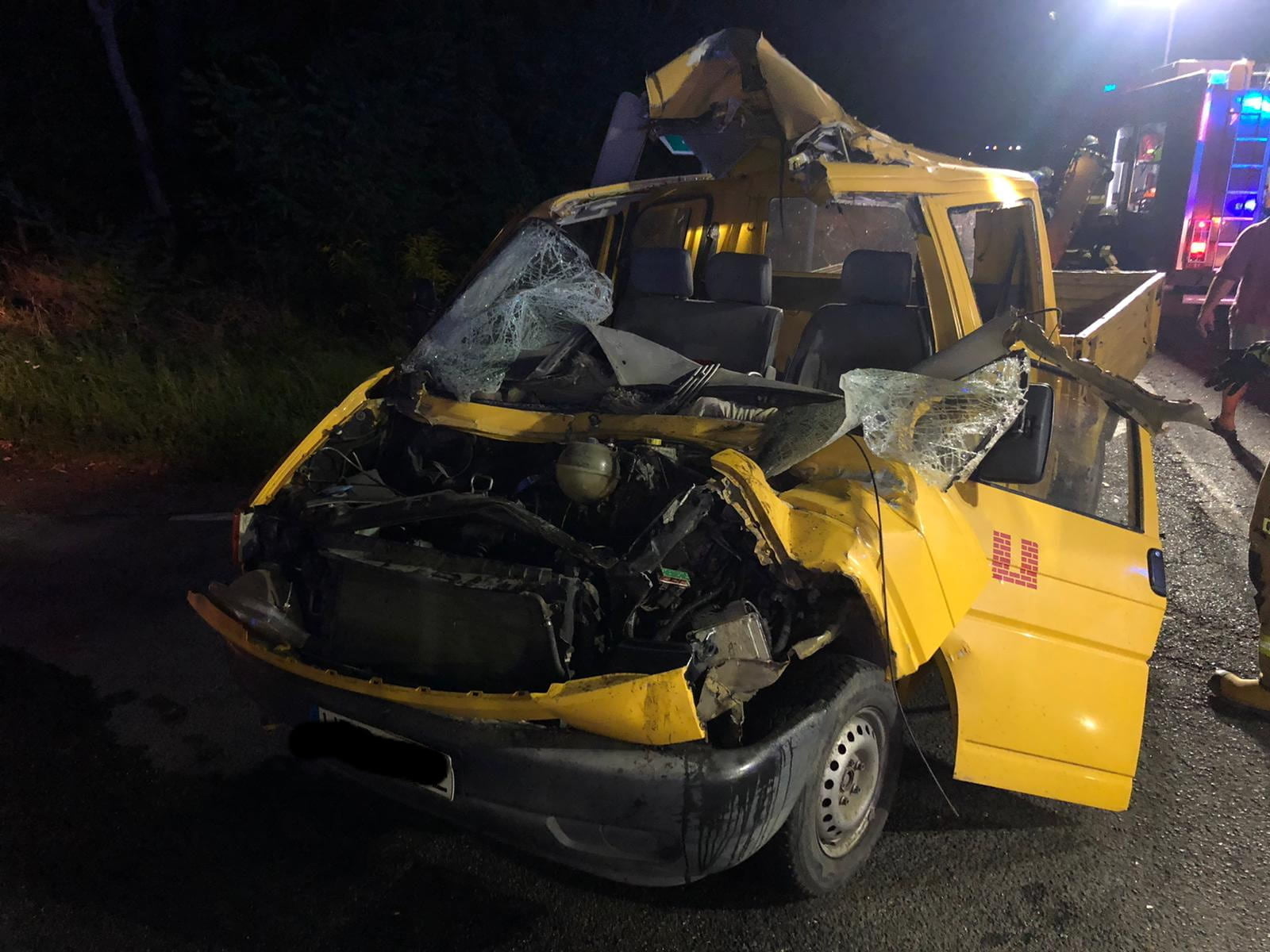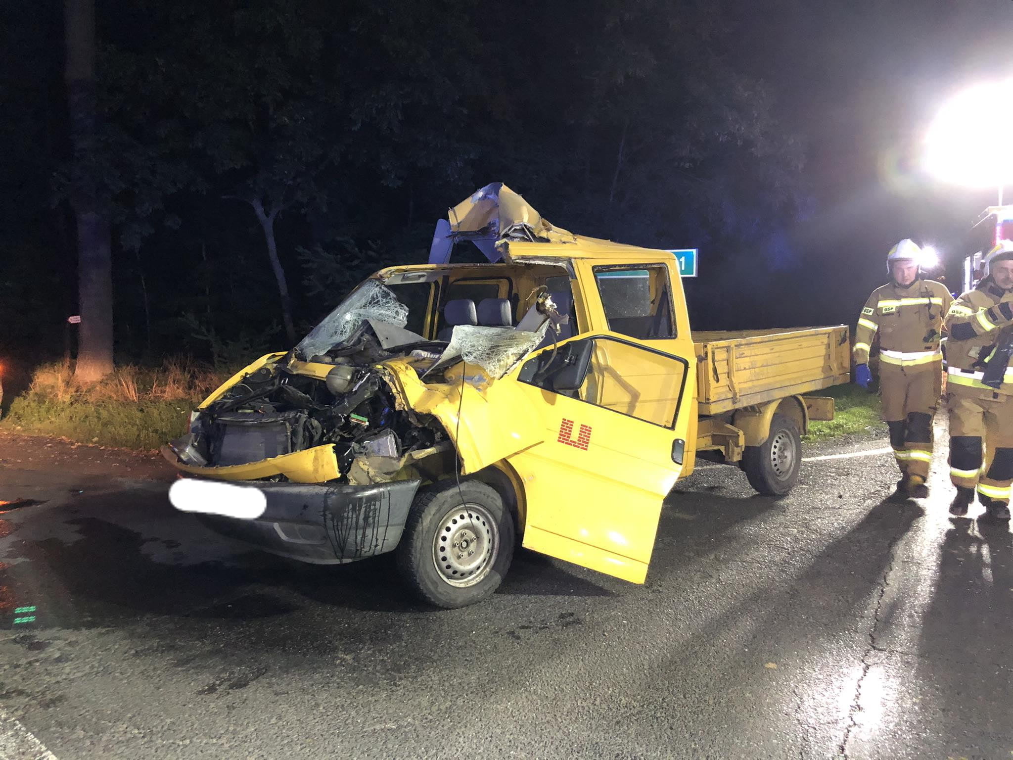 Maszyna miała być kompletnie nieoświetlona i to właśnie w jej tył uderzył dostawczak. Jedna osoba została ranna. Droga musiała zostać zablokowana.