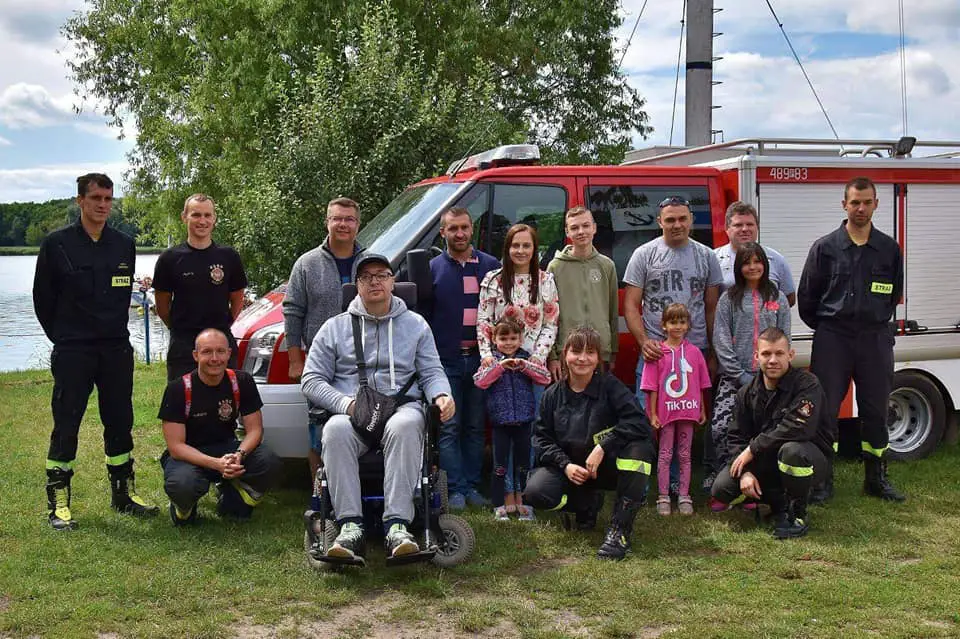 Przypominamy, że Grupa powstała by pomóc Panu Przemkowi w rehabilitacji po ciężkiej chorobie jaką był złośliwy rak mózgu w 2013 roku. Od tamtego czasu poruszał się na wózku inwalidzkim i rehabilitacja potrzebna jest cały czas by mógł stanąć na własnych nogach. Pan Przemek już porusza się o kulach i mamy nadzieję, że za jakiś czas będzie w znacznym lub całkowitym stopniu mógł radzić sobie bez wózka. Kwota, która została zebrana dzięki tej inicjatywie na pomoc dla Przemka to 10.632 zł. Dlatego zwycięscy licytacji: Grupa – Dajmy pomoc ludziom w potrzebie i Krzysztof Furmaniak postanowili zaprosić na dzień ze strażakami właśnie Przemka by mógł miło spędzić czas z organizatorami licytacji ale też z wszystkim zwycięzcami i ich rodzinami oraz Strażakami.