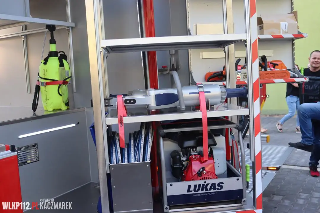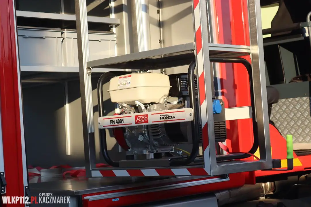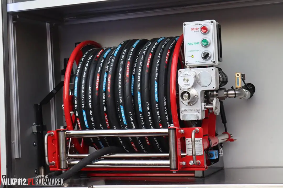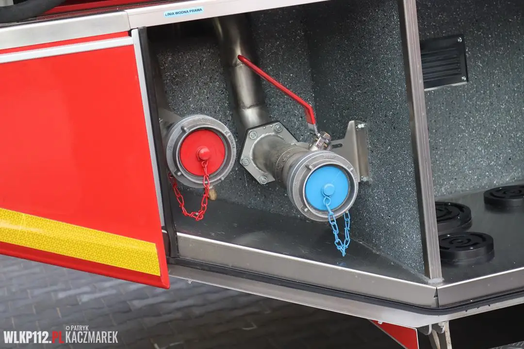 - Zbiornik środków gaśniczych – zbiornik wody o pojemności 3000l (kompozytowy), zbiornik środka o pojemności 300l (kompozytowy), automatyczny zawór napełnienia hydrantowego,