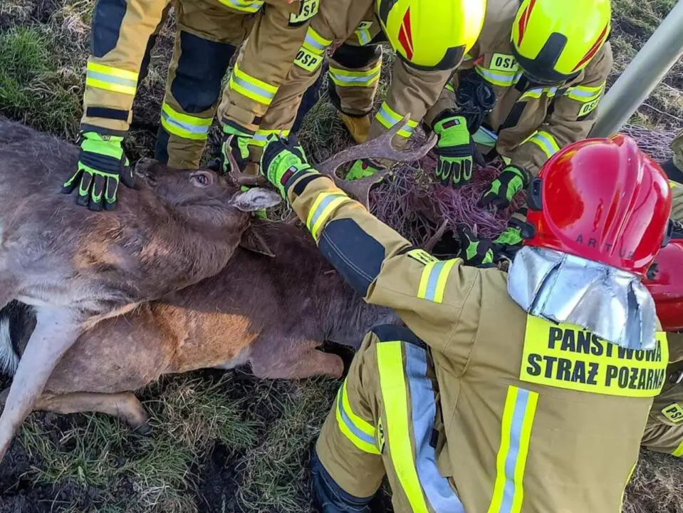 Strażacy po przybyciu we wskazane miejsce potwierdzili treść zgłoszenia iż dwa jelenie zaplątały się porożami w siatkę. Strażacy bez wahania przystąpili do działań, a już po kilkudziesięciu minutach udało się uwolnić zwierzęta.