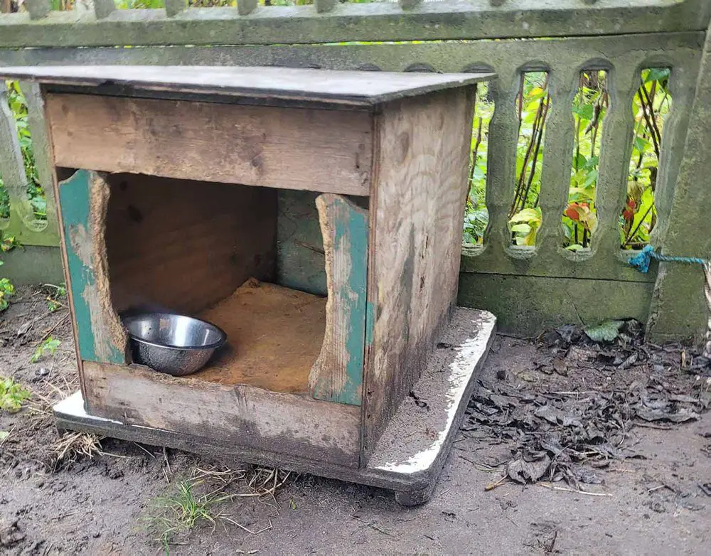 Warunki żucia szczeniaczka były fatalne. Buda, w której mieszkał, nie zapewniała właściwego zabezpieczenia przed wiatrem, mrozem i deszczem. Piesek był wychudzony z głodu.