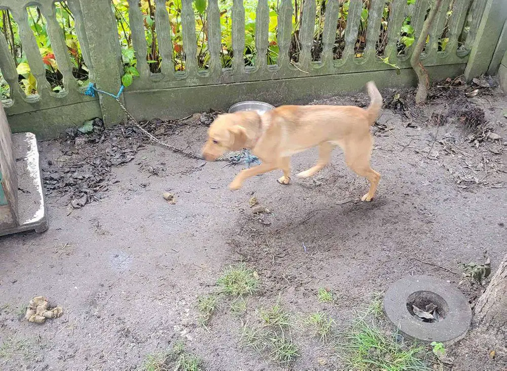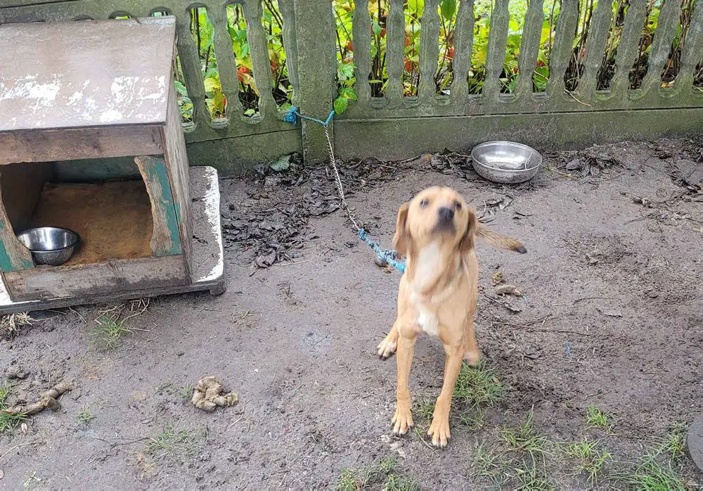 Po wejściu na posesję oczom funkcjonariuszy ukazał się bardzo przykry widok. Zobaczyli małego, zaledwie ośmiomiesięcznego wychudzonego szczeniaczka. Był przywiązany do płoty metrowym sznurkiem. Wchodził tylko do obskurnej budy.