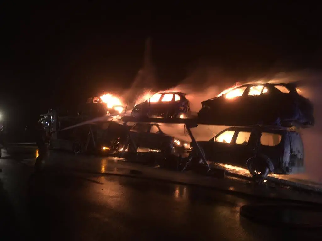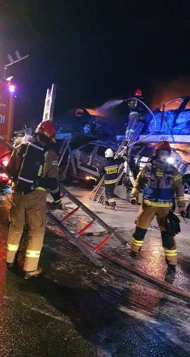 Po przybyciu pierwszego zastępu na miejsce zdarzenia strażacy zastali w pełni rozwinięty pożar kilku samochodów. Na autolawecie znajdowało się łącznie 9 samochodów z czego sześć spłonęło doszczętnie, dwa uległy tylko opaleniu. Udało się uratować jeden pojazd oraz samochód ciężarowy, który je przewoził.