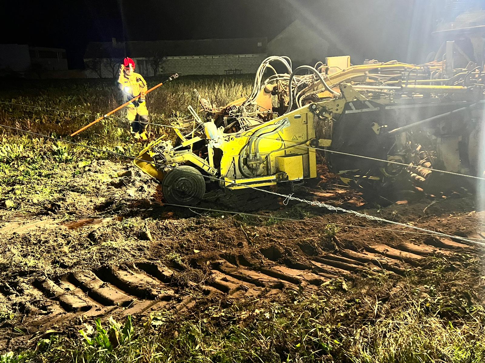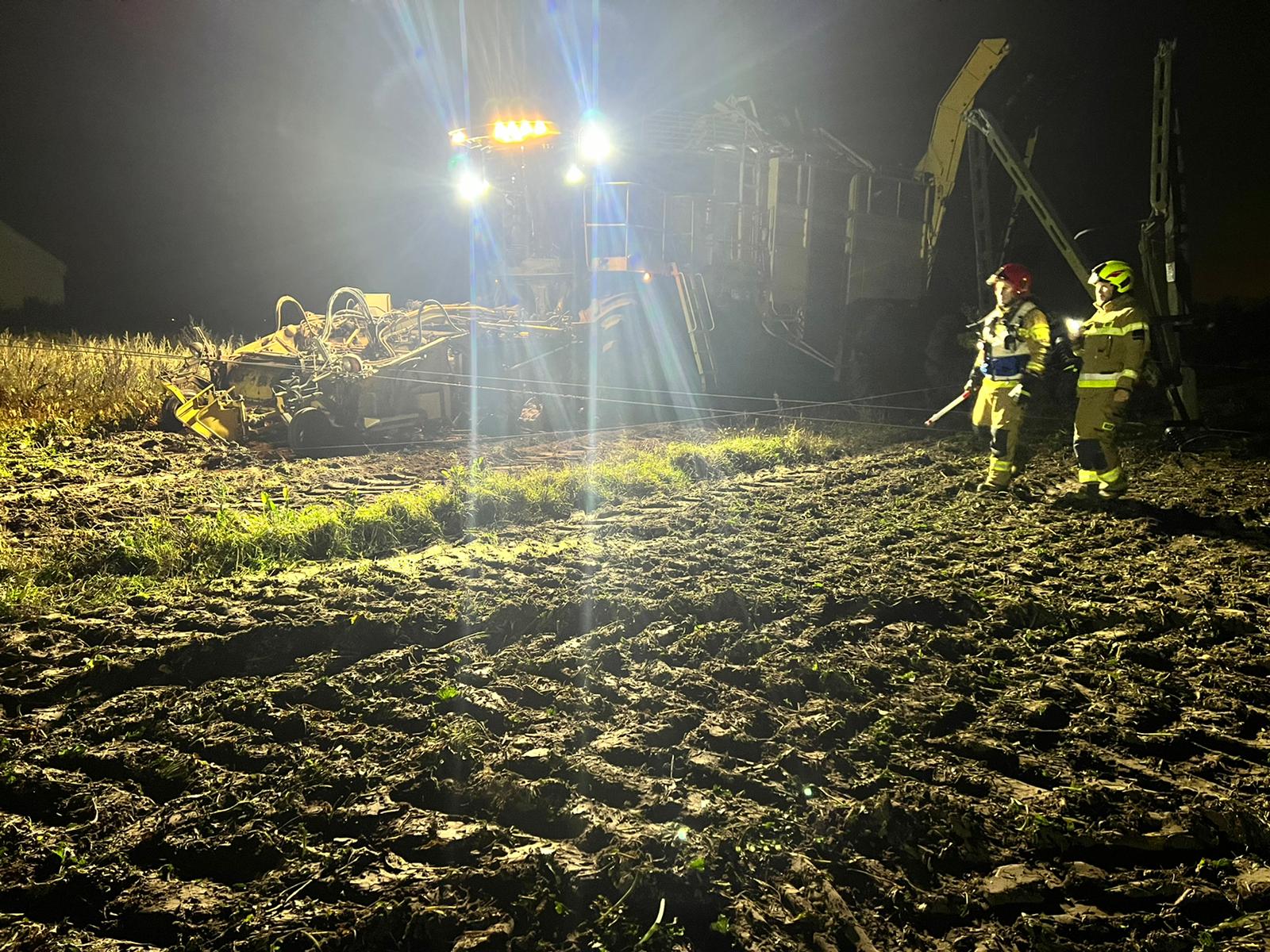 Podczas prowadzonych prac polowych kombajn do zbioru buraków uderzył w słup przesyłowy średniego napięcia, w wyniku czego zerwane zostały linie energetyczne pod napięciem, które zawisły na maszynie. Operator kombajnu nie doznał żadnych obrażeń jednakże nie był w stanie samodzielnie opuścić pojazdu.