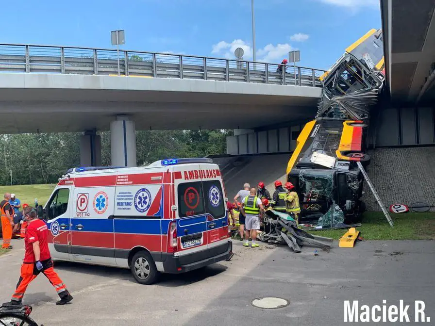 Autobus komunikacji miejskiej spadł z wiaduktu na trasie S8 na rozwidleniu w kierunku Wisłostrady. Trwa akcja!